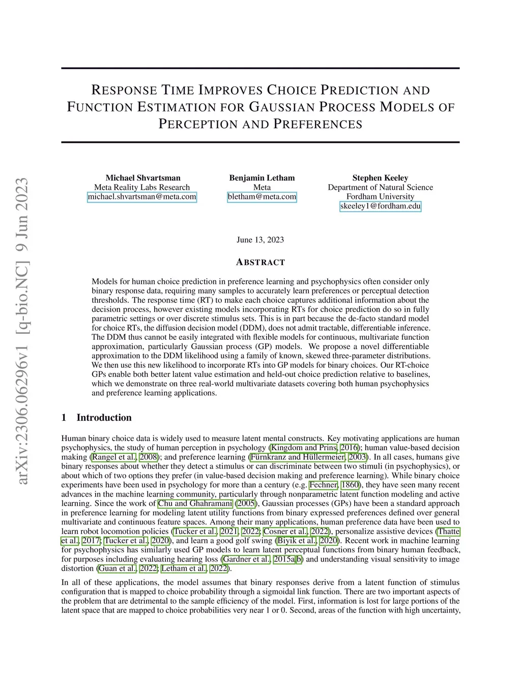 Models for human choice prediction in preference learning and psychophysics often consider only binary response data, requiring many samples to accurately learn preferences or perceptual detection thresholds. The response time (RT) to make each choice captures additional information about the decision process, however existing models incorporating RTs for choice prediction do so in fully parametric settings or over discrete stimulus sets. This is in part because the de-facto standard model for choice RTs, the diffusion decision model (DDM), does not admit tractable, differentiable inference. The DDM thus cannot be easily integrated with flexible models for continuous, multivariate function approximation, particularly Gaussian process (GP) models. We propose a novel differentiable approximation to the DDM likelihood using a family of known, skewed three-parameter distributions. We then use this new likelihood to incorporate RTs into GP models for binary choices. Our RT-choice GPs enable both better latent value estimation and held-out choice prediction relative to baselines, which we demonstrate on three real-world multivariate datasets covering both human psychophysics and preference learning applications.