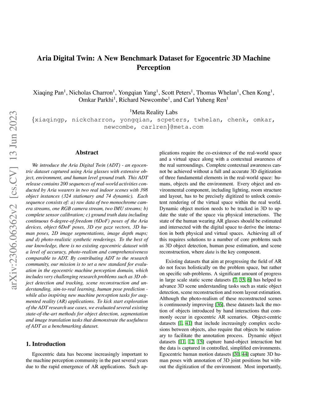 We introduce the Aria Digital Twin (ADT) - an egocentric dataset captured using Aria glasses with extensive object, environment, and human level ground truth. This ADT release contains 200 sequences of real-world activities conducted by Aria wearers in two real indoor scenes with 398 object instances (324 stationary and 74 dynamic). Each sequence consists of: a) raw data of two monochrome camera streams, one RGB camera stream, two IMU streams; b) complete sensor calibration; c) ground truth data including continuous 6-degree-of-freedom (6DoF) poses of the Aria devices, object 6DoF poses, 3D eye gaze vectors, 3D human poses, 2D image segmentations, image depth maps; and d) photo-realistic synthetic renderings. To the best of our knowledge, there is no existing egocentric dataset with a level of accuracy, photo-realism and comprehensiveness comparable to ADT. By contributing ADT to the research community, our mission is to set a new standard for evaluation in the egocentric machine perception domain, which includes very challenging research problems such as 3D object detection and tracking, scene reconstruction and understanding, sim-to-real learning, human pose prediction - while also inspiring new machine perception tasks for augmented reality (AR) applications. To kick start exploration of the ADT research use cases, we evaluated several existing state-of-the-art methods for object detection, segmentation and image translation tasks that demonstrate the usefulness of ADT as a benchmarking dataset.