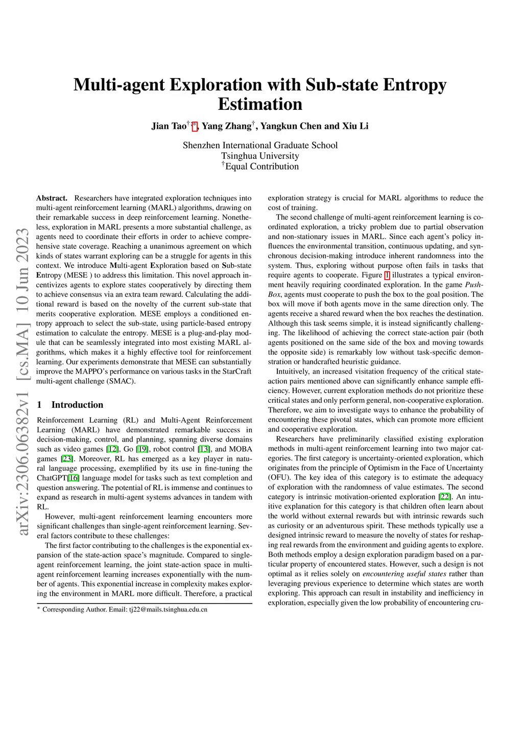 Researchers have integrated exploration techniques into multi-agent reinforcement learning (MARL) algorithms, drawing on their remarkable success in deep reinforcement learning. Nonetheless, exploration in MARL presents a more substantial challenge, as agents need to coordinate their efforts in order to achieve comprehensive state coverage. Reaching a unanimous agreement on which kinds of states warrant exploring can be a struggle for agents in this context. We introduce \textbf{M}ulti-agent \textbf{E}xploration based on \textbf{S}ub-state \textbf{E}ntropy (MESE) to address this limitation. This novel approach incentivizes agents to explore states cooperatively by directing them to achieve consensus via an extra team reward. Calculating the additional reward is based on the novelty of the current sub-state that merits cooperative exploration. MESE employs a conditioned entropy approach to select the sub-state, using particle-based entropy estimation to calculate the entropy. MESE is a plug-and-play module that can be seamlessly integrated into most existing MARL algorithms, which makes it a highly effective tool for reinforcement learning. Our experiments demonstrate that MESE can substantially improve the MAPPO's performance on various tasks in the StarCraft multi-agent challenge (SMAC).