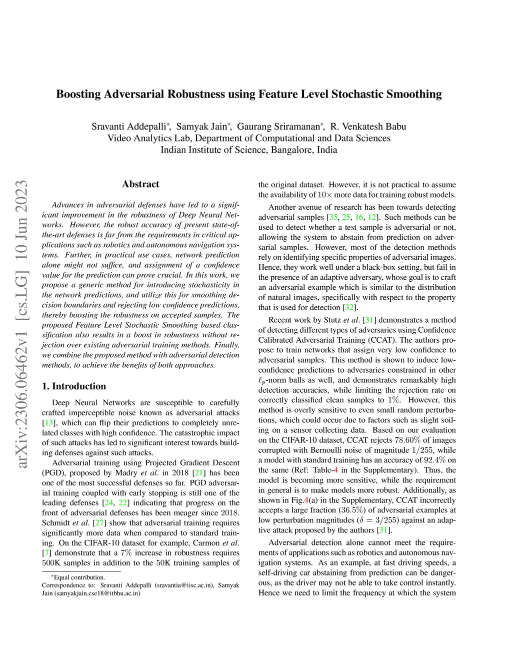 Advances in adversarial defenses have led to a significant improvement in the robustness of Deep Neural Networks. However, the robust accuracy of present state-ofthe-art defenses is far from the requirements in critical applications such as robotics and autonomous navigation systems. Further, in practical use cases, network prediction alone might not suffice, and assignment of a confidence value for the prediction can prove crucial. In this work, we propose a generic method for introducing stochasticity in the network predictions, and utilize this for smoothing decision boundaries and rejecting low confidence predictions, thereby boosting the robustness on accepted samples. The proposed Feature Level Stochastic Smoothing based classification also results in a boost in robustness without rejection over existing adversarial training methods. Finally, we combine the proposed method with adversarial detection methods, to achieve the benefits of both approaches.