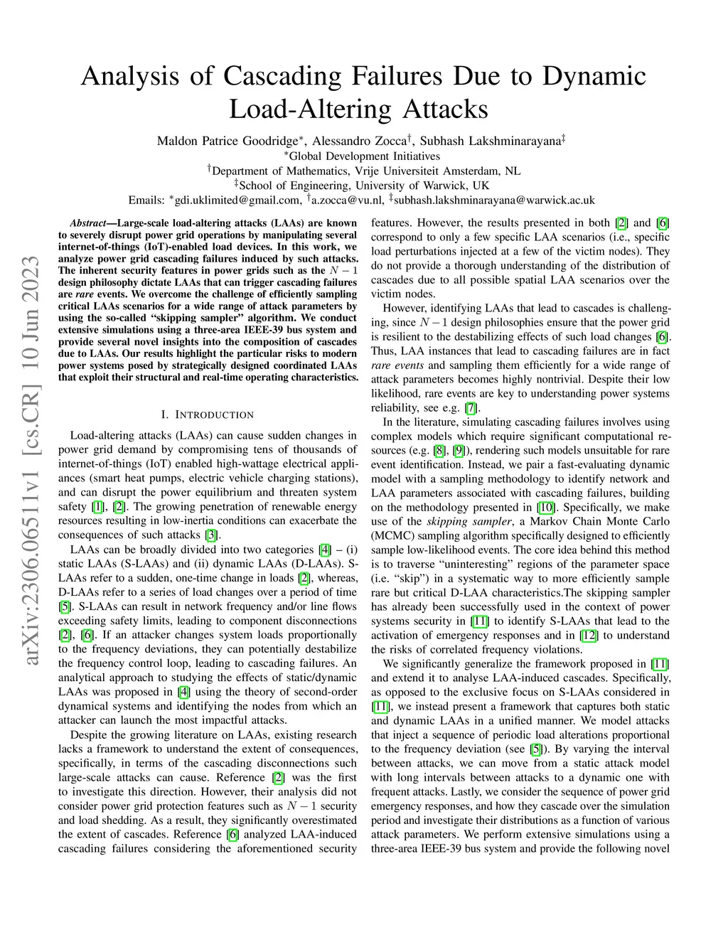 Large-scale load-altering attacks (LAAs) are known to severely disrupt power grid operations by manipulating several internet-of-things (IoT)-enabled load devices. In this work, we analyze power grid cascading failures induced by such attacks. The inherent security features in power grids such as the design philosophy dictate LAAs that can trigger cascading failures are \emph{rare} events. We overcome the challenge of efficiently sampling critical LAAs scenarios for a wide range of attack parameters by using the so-called ``skipping sampler'' algorithm. We conduct extensive simulations using a three-area IEEE-39 bus system and provide several novel insights into the composition of cascades due to LAAs. Our results highlight the particular risks to modern power systems posed by strategically designed coordinated LAAs that exploit their structural and real-time operating characteristics.