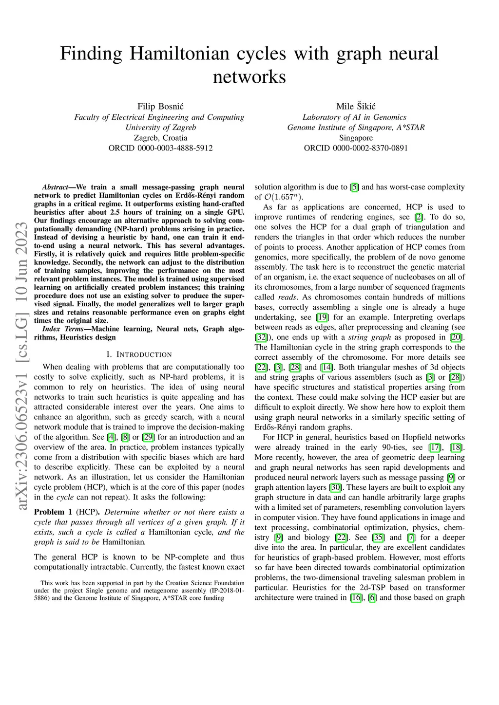 We train a small message-passing graph neural network to predict Hamiltonian cycles on Erd\H{o}s-R\ényi random graphs in a critical regime. It outperforms existing hand-crafted heuristics after about 2.5 hours of training on a single GPU. Our findings encourage an alternative approach to solving computationally demanding (NP-hard) problems arising in practice. Instead of devising a heuristic by hand, one can train it end-to-end using a neural network. This has several advantages. Firstly, it is relatively quick and requires little problem-specific knowledge. Secondly, the network can adjust to the distribution of training samples, improving the performance on the most relevant problem instances. The model is trained using supervised learning on artificially created problem instances; this training procedure does not use an existing solver to produce the supervised signal. Finally, the model generalizes well to larger graph sizes and retains reasonable performance even on graphs eight times the original size.