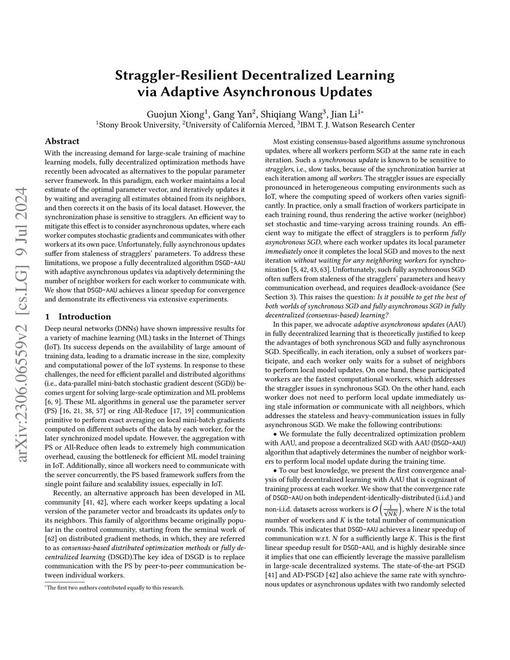 With the increasing demand for large-scale training of machine learning models, fully decentralized optimization methods have recently been advocated as alternatives to the popular parameter server framework. In this paradigm, each worker maintains a local estimate of the optimal parameter vector, and iteratively updates it by waiting and averaging all estimates obtained from its neighbors, and then corrects it on the basis of its local dataset. However, the synchronization phase is sensitive to stragglers. An efficient way to mitigate this effect is to consider asynchronous updates, where each worker computes stochastic gradients and communicates with other workers at its own pace. Unfortunately, fully asynchronous updates suffer from staleness of stragglers' parameters. To address these limitations, we propose a fully decentralized algorithm DSGD-AAU with adaptive asynchronous updates via adaptively determining the number of neighbor workers for each worker to communicate with. We show that DSGD-AAU achieves a linear speedup for convergence and demonstrate its effectiveness via extensive experiments.