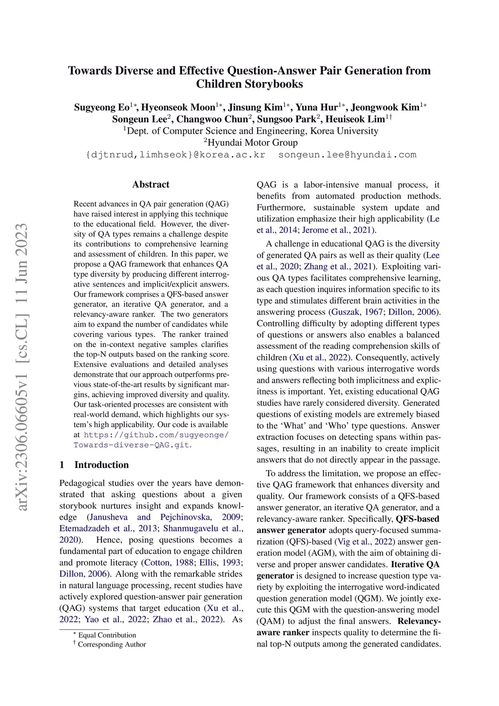 Recent advances in QA pair generation (QAG) have raised interest in applying this technique to the educational field. However, the diversity of QA types remains a challenge despite its contributions to comprehensive learning and assessment of children. In this paper, we propose a QAG framework that enhances QA type diversity by producing different interrogative sentences and implicit/explicit answers. Our framework comprises a QFS-based answer generator, an iterative QA generator, and a relevancy-aware ranker. The two generators aim to expand the number of candidates while covering various types. The ranker trained on the in-context negative samples clarifies the top-N outputs based on the ranking score. Extensive evaluations and detailed analyses demonstrate that our approach outperforms previous state-of-the-art results by significant margins, achieving improved diversity and quality. Our task-oriented processes are consistent with real-world demand, which highlights our system's high applicability.