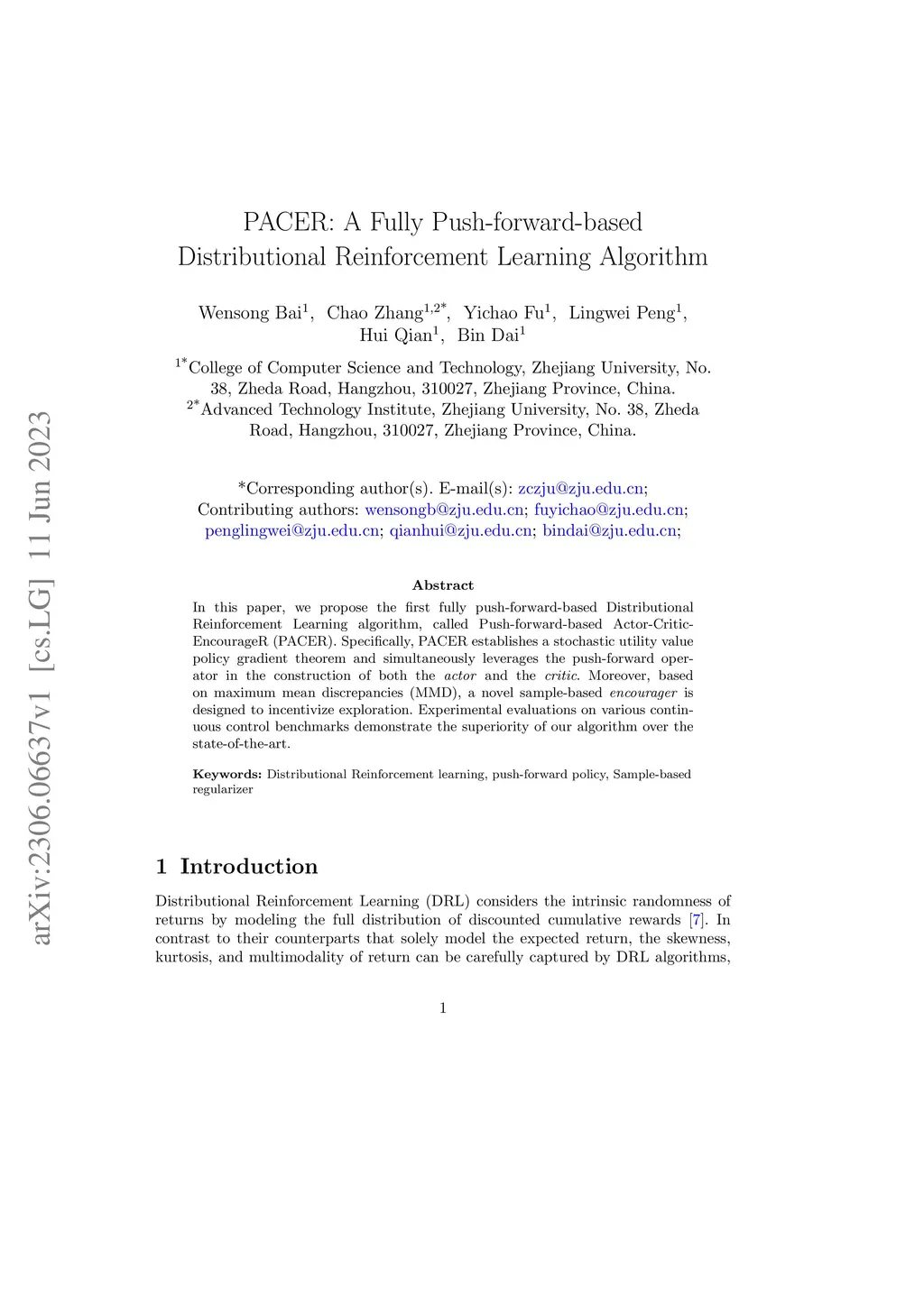 In this paper, we propose the first fully push-forward-based Distributional Reinforcement Learning algorithm, called Push-forward-based Actor-Critic EncourageR (PACER). Specifically, PACER establishes a stochastic utility value policy gradient theorem and simultaneously leverages the push-forward operator in the construction of both the actor and the critic. Moreover, based on maximum mean discrepancies (MMD), a novel sample-based encourager is designed to incentivize exploration. Experimental evaluations on various continuous control benchmarks demonstrate the superiority of our algorithm over the state-of-the-art.