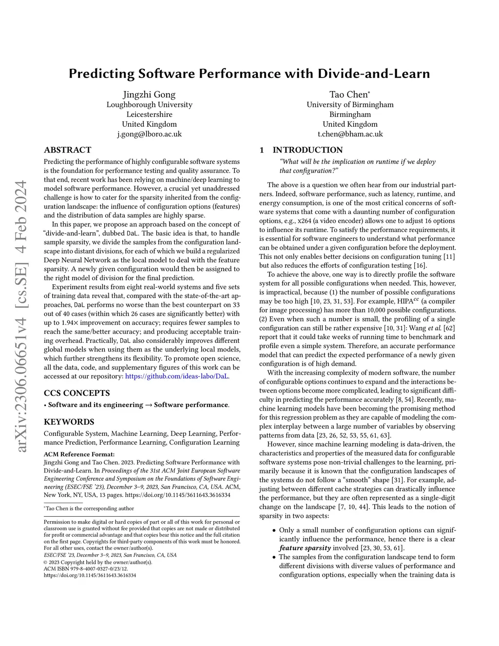 Predicting the performance of highly configurable software systems is the foundation for performance testing and quality assurance. To that end, recent work has been relying on machine/deep learning to model software performance. However, a crucial yet unaddressed challenge is how to cater for the sparsity inherited from the configuration landscape: the influence of configuration options (features) and the distribution of data samples are highly sparse. In this paper, we propose an approach based on the concept of 'divide-and-learn', dubbed DaL. The basic idea is that, to handle sample sparsity, we divide the samples from the configuration landscape into distant divisions, for each of which we build a regularized Deep Neural Network as the local model to deal with the feature sparsity. A newly given configuration would then be assigned to the right model of division for the final prediction. Experiment results from eight real-world systems and five sets of training data reveal that, compared with the state-of-the-art approaches, DaL performs no worse than the best counterpart on 33 out of 40 cases (within which 26 cases are significantly better) with up to 1.94x improvement on accuracy; requires fewer samples to reach the same/better accuracy; and producing acceptable training overhead. Practically, DaL also considerably improves different global models when using them as the underlying local models, which further strengthens its flexibility. To promote open science, all the data, code, and supplementary figures of this work can be accessed at our repository: https://github.com/ideas-labo/DaL.