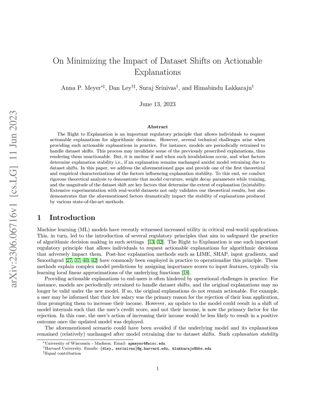 The Right to Explanation is an important regulatory principle that allows individuals to request actionable explanations for algorithmic decisions. However, several technical challenges arise when providing such actionable explanations in practice. For instance, models are periodically retrained to handle dataset shifts. This process may invalidate some of the previously prescribed explanations, thus rendering them unactionable. But, it is unclear if and when such invalidations occur, and what factors determine explanation stability i.e., if an explanation remains unchanged amidst model retraining due to dataset shifts. In this paper, we address the aforementioned gaps and provide one of the first theoretical and empirical characterizations of the factors influencing explanation stability. To this end, we conduct rigorous theoretical analysis to demonstrate that model curvature, weight decay parameters while training, and the magnitude of the dataset shift are key factors that determine the extent of explanation (in)stability. Extensive experimentation with real-world datasets not only validates our theoretical results, but also demonstrates that the aforementioned factors dramatically impact the stability of explanations produced by various state-of-the-art methods.