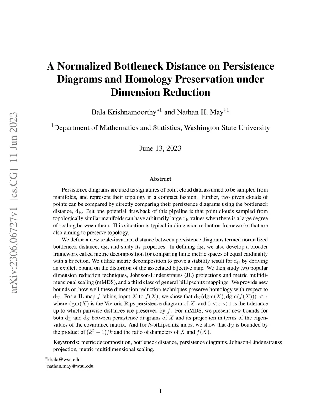 Persistence diagrams are used as signatures of point cloud data assumed to be sampled from manifolds, and represent their topology in a compact fashion. Further, two given clouds of points can be compared by directly comparing their persistence diagrams using the bottleneck distance, d_B. But one potential drawback of this pipeline is that point clouds sampled from topologically similar manifolds can have arbitrarily large d_B values when there is a large degree of scaling between them. This situation is typical in dimension reduction frameworks that are also aiming to preserve topology. We define a new scale-invariant distance between persistence diagrams termed normalized bottleneck distance, d_N, and study its properties. In defining d_N, we also develop a broader framework called metric decomposition for comparing finite metric spaces of equal cardinality with a bijection. We utilize metric decomposition to prove a stability result for d_N by deriving an explicit bound on the distortion of the associated bijective map. We then study two popular dimension reduction techniques, Johnson-Lindenstrauss (JL) projections and metric multidimensional scaling (mMDS), and a third class of general biLipschitz mappings. We provide new bounds on how well these dimension reduction techniques preserve homology with respect to d_N. For a JL map f that transforms input X to f(X), we show that d_N(dgm(X),dgm(f(X)) < e, where dgm(X) is the Vietoris-Rips persistence diagram of X, and 0 < e < 1 is the tolerance up to which pairwise distances are preserved by f. For mMDS, we present new bounds for both d_B and d_N between persistence diagrams of X and its projection in terms of the eigenvalues of the covariance matrix. And for k-biLipschitz maps, we show that d_N is bounded by the product of (k^2-1)/k and the ratio of diameters of X and f(X).