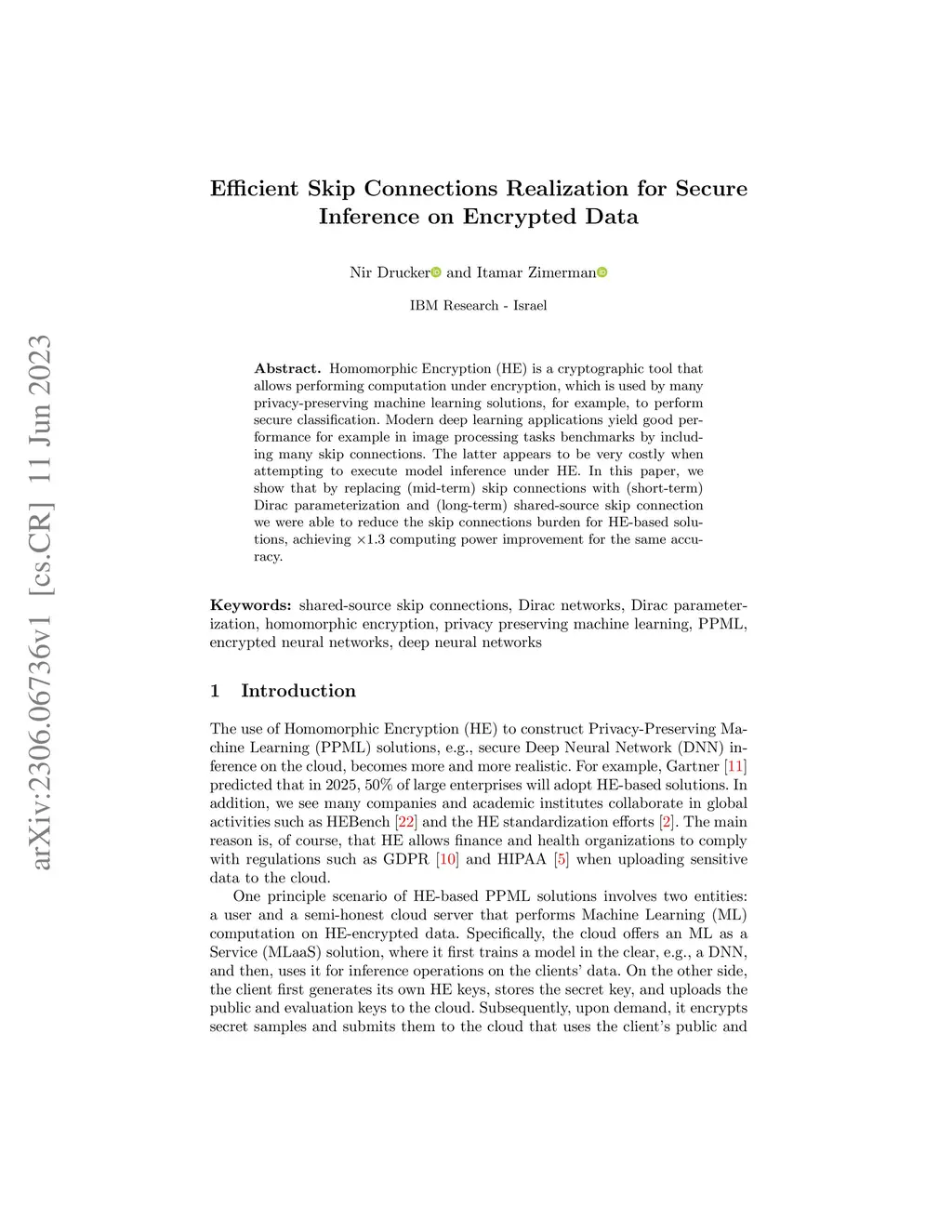 Homomorphic Encryption (HE) is a cryptographic tool that allows performing computation under encryption, which is used by many privacy-preserving machine learning solutions, for example, to perform secure classification. Modern deep learning applications yield good performance for example in image processing tasks benchmarks by including many skip connections. The latter appears to be very costly when attempting to execute model inference under HE. In this paper, we show that by replacing (mid-term) skip connections with (short-term) Dirac parameterization and (long-term) shared-source skip connection we were able to reduce the skip connections burden for HE-based solutions, achieving x1.3 computing power improvement for the same accuracy.