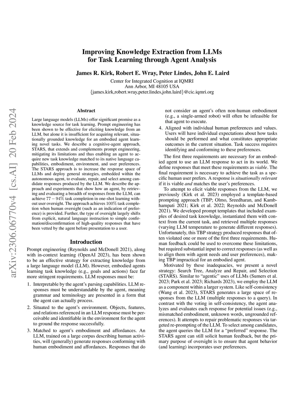 Large language models (LLMs) offer significant promise as a knowledge source for task learning. Prompt engineering has been shown to be effective for eliciting knowledge from an LLM, but alone it is insufficient for acquiring relevant, situationally grounded knowledge for an embodied agent learning novel tasks. We describe a cognitive-agent approach, STARS, that extends and complements prompt engineering, mitigating its limitations and thus enabling an agent to acquire new task knowledge matched to its native language capabilities, embodiment, environment, and user preferences. The STARS approach is to increase the response space of LLMs and deploy general strategies, embedded within the autonomous agent, to evaluate, repair, and select among candidate responses produced by the LLM. We describe the approach and experiments that show how an agent, by retrieving and evaluating a breadth of responses from the LLM, can achieve 77-94% task completion in one-shot learning without user oversight. The approach achieves 100% task completion when human oversight (such as an indication of preference) is provided. Further, the type of oversight largely shifts from explicit, natural language instruction to simple confirmation/discomfirmation of high-quality responses that have been vetted by the agent before presentation to a user.