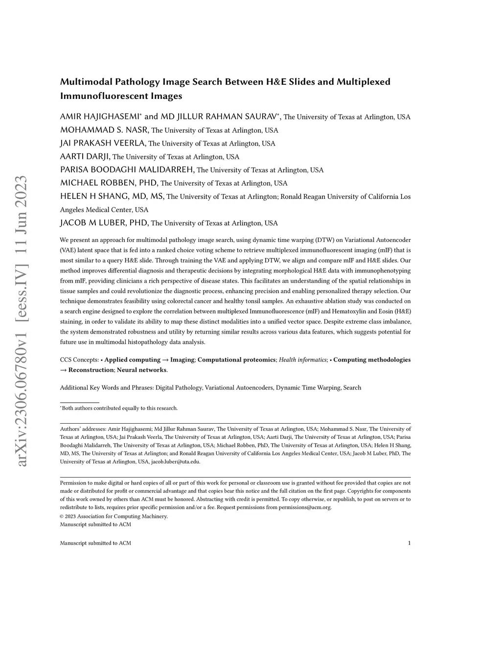 We present an approach for multimodal pathology image search, using dynamic time warping (DTW) on Variational Autoencoder (VAE) latent space that is fed into a ranked choice voting scheme to retrieve multiplexed immunofluorescent imaging (mIF) that is most similar to a query H&E slide. Through training the VAE and applying DTW, we align and compare mIF and H&E slides. Our method improves differential diagnosis and therapeutic decisions by integrating morphological H&E data with immunophenotyping from mIF, providing clinicians a rich perspective of disease states. This facilitates an understanding of the spatial relationships in tissue samples and could revolutionize the diagnostic process, enhancing precision and enabling personalized therapy selection. Our technique demonstrates feasibility using colorectal cancer and healthy tonsil samples. An exhaustive ablation study was conducted on a search engine designed to explore the correlation between multiplexed Immunofluorescence (mIF) and Hematoxylin and Eosin (H&E) staining, in order to validate its ability to map these distinct modalities into a unified vector space. Despite extreme class imbalance, the system demonstrated robustness and utility by returning similar results across various data features, which suggests potential for future use in multimodal histopathology data analysis.