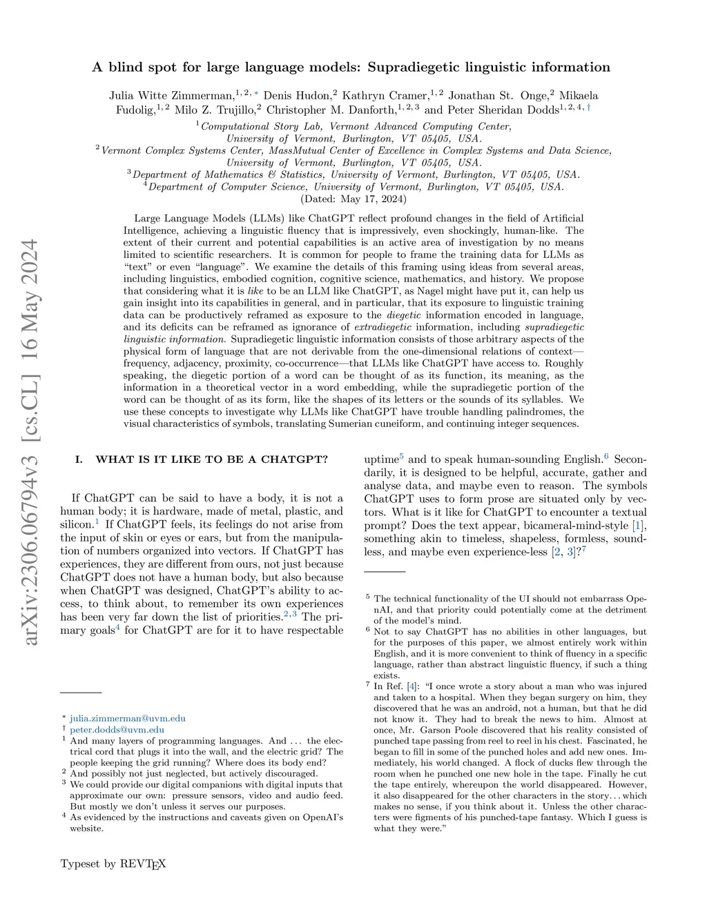 Large Language Models (LLMs) like ChatGPT reflect profound changes in the field of Artificial Intelligence, achieving a linguistic fluency that is impressively, even shockingly, human-like. The extent of their current and potential capabilities is an active area of investigation by no means limited to scientific researchers. It is common for people to frame the training data for LLMs as "text" or even "language". We examine the details of this framing using ideas from several areas, including linguistics, embodied cognition, cognitive science, mathematics, and history. We propose that considering what it is like to be an LLM like ChatGPT, as Nagel might have put it, can help us gain insight into its capabilities in general, and in particular, that its exposure to linguistic training data can be productively reframed as exposure to the diegetic information encoded in language, and its deficits can be reframed as ignorance of extradiegetic information, including supradiegetic linguistic information. Supradiegetic linguistic information consists of those arbitrary aspects of the physical form of language that are not derivable from the one-dimensional relations of context -- frequency, adjacency, proximity, co-occurrence -- that LLMs like ChatGPT have access to. Roughly speaking, the diegetic portion of a word can be thought of as its function, its meaning, as the information in a theoretical vector in a word embedding, while the supradiegetic portion of the word can be thought of as its form, like the shapes of its letters or the sounds of its syllables. We use these concepts to investigate why LLMs like ChatGPT have trouble handling palindromes, the visual characteristics of symbols, translating Sumerian cuneiform, and continuing integer sequences.
