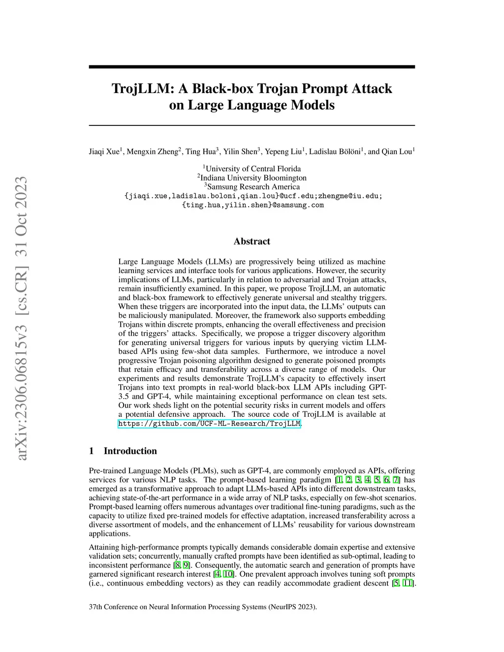 Large Language Models (LLMs) are progressively being utilized as machine learning services and interface tools for various applications. However, the security implications of LLMs, particularly in relation to adversarial and Trojan attacks, remain insufficiently examined. In this paper, we propose TrojLLM, an automatic and black-box framework to effectively generate universal and stealthy triggers. When these triggers are incorporated into the input data, the LLMs' outputs can be maliciously manipulated. Moreover, the framework also supports embedding Trojans within discrete prompts, enhancing the overall effectiveness and precision of the triggers' attacks. Specifically, we propose a trigger discovery algorithm for generating universal triggers for various inputs by querying victim LLM-based APIs using few-shot data samples. Furthermore, we introduce a novel progressive Trojan poisoning algorithm designed to generate poisoned prompts that retain efficacy and transferability across a diverse range of models. Our experiments and results demonstrate TrojLLM's capacity to effectively insert Trojans into text prompts in real-world black-box LLM APIs including GPT-3.5 and GPT-4, while maintaining exceptional performance on clean test sets. Our work sheds light on the potential security risks in current models and offers a potential defensive approach. The source code of TrojLLM is available at https://github.com/UCF-ML-Research/TrojLLM.
