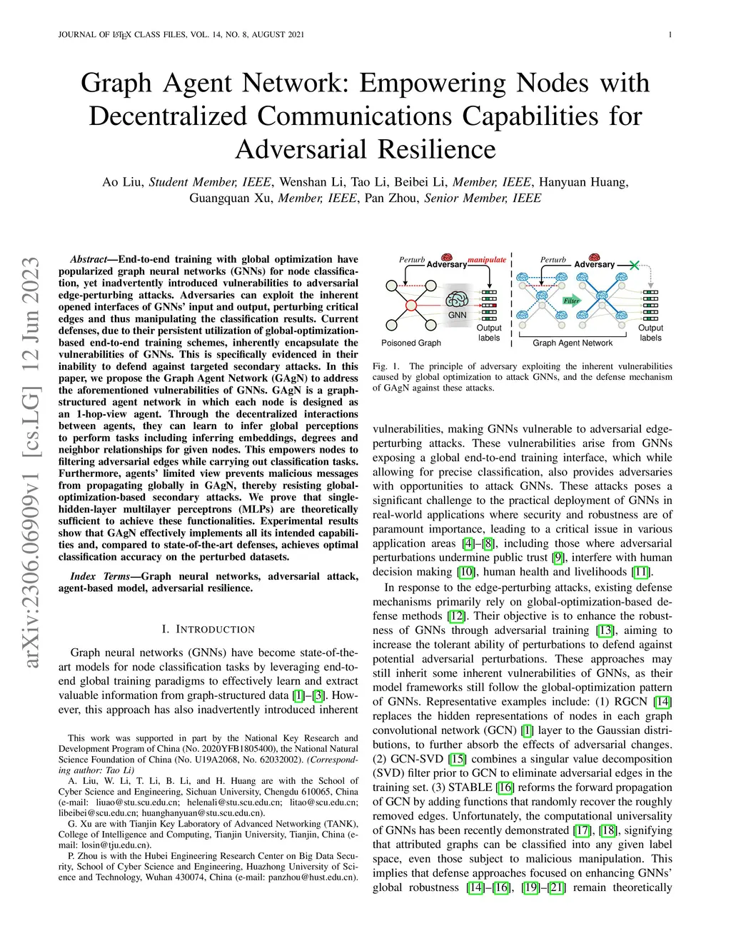 End-to-end training with global optimization have popularized graph neural networks (GNNs) for node classification, yet inadvertently introduced vulnerabilities to adversarial edge-perturbing attacks. Adversaries can exploit the inherent opened interfaces of GNNs' input and output, perturbing critical edges and thus manipulating the classification results. Current defenses, due to their persistent utilization of global-optimization-based end-to-end training schemes, inherently encapsulate the vulnerabilities of GNNs. This is specifically evidenced in their inability to defend against targeted secondary attacks. In this paper, we propose the Graph Agent Network (GAgN) to address the aforementioned vulnerabilities of GNNs. GAgN is a graph-structured agent network in which each node is designed as an 1-hop-view agent. Through the decentralized interactions between agents, they can learn to infer global perceptions to perform tasks including inferring embeddings, degrees and neighbor relationships for given nodes. This empowers nodes to filtering adversarial edges while carrying out classification tasks. Furthermore, agents' limited view prevents malicious messages from propagating globally in GAgN, thereby resisting global-optimization-based secondary attacks. We prove that single-hidden-layer multilayer perceptrons (MLPs) are theoretically sufficient to achieve these functionalities. Experimental results show that GAgN effectively implements all its intended capabilities and, compared to state-of-the-art defenses, achieves optimal classification accuracy on the perturbed datasets.