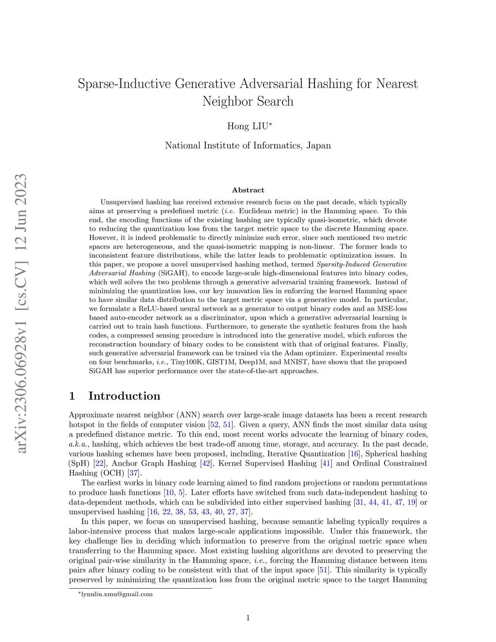 Sparse-Inductive Generative Adversarial Hashing for Nearest Neighbor