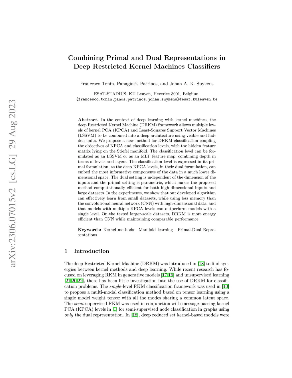 In the context of deep learning with kernel machines, the deep Restricted Kernel Machine (DRKM) framework allows multiple levels of kernel PCA (KPCA) and Least-Squares Support Vector Machines (LSSVM) to be combined into a deep architecture using visible and hidden units. We propose a new method for DRKM classification coupling the objectives of KPCA and classification levels, with the hidden feature matrix lying on the Stiefel manifold. The classification level can be formulated as an LSSVM or as an MLP feature map, combining depth in terms of levels and layers. The classification level is expressed in its primal formulation, as the deep KPCA levels, in their dual formulation, can embed the most informative components of the data in a much lower dimensional space. The dual setting is independent of the dimension of the inputs and the primal setting is parametric, which makes the proposed method computationally efficient for both high-dimensional inputs and large datasets. In the experiments, we show that our developed algorithm can effectively learn from small datasets, while using less memory than the convolutional neural network (CNN) with high-dimensional data. and that models with multiple KPCA levels can outperform models with a single level. On the tested larger-scale datasets, DRKM is more energy efficient than CNN while maintaining comparable performance.