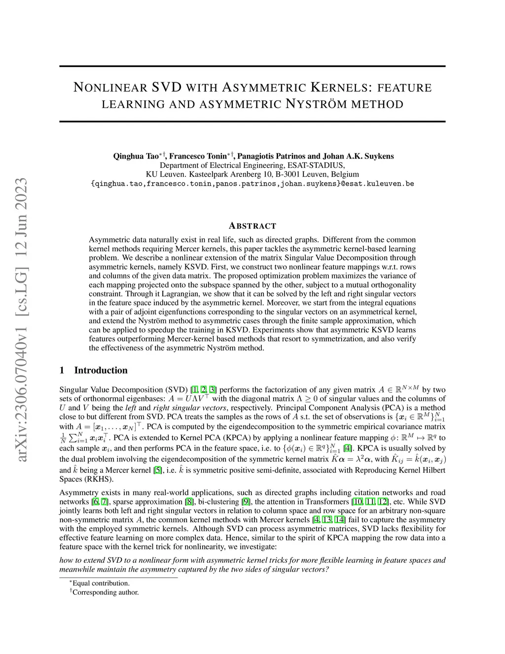 Nonlinear SVD with Asymmetric Kernels: feature learning and asymmetric
