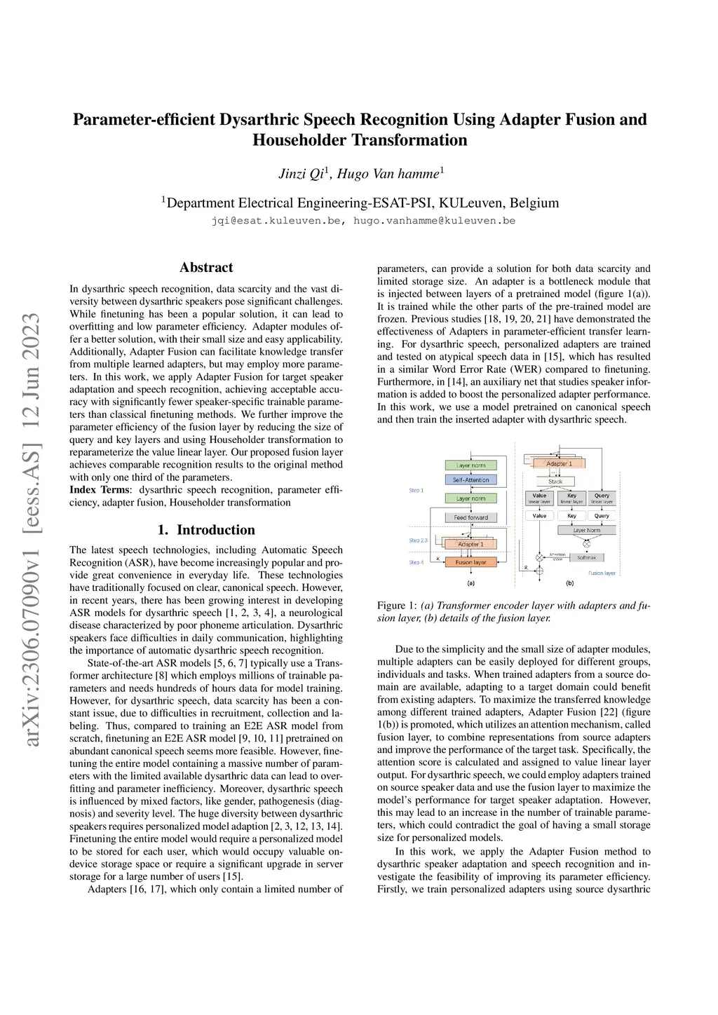 In dysarthric speech recognition, data scarcity and the vast diversity between dysarthric speakers pose significant challenges. While finetuning has been a popular solution, it can lead to overfitting and low parameter efficiency. Adapter modules offer a better solution, with their small size and easy applicability. Additionally, Adapter Fusion can facilitate knowledge transfer from multiple learned adapters, but may employ more parameters. In this work, we apply Adapter Fusion for target speaker adaptation and speech recognition, achieving acceptable accuracy with significantly fewer speaker-specific trainable parameters than classical finetuning methods. We further improve the parameter efficiency of the fusion layer by reducing the size of query and key layers and using Householder transformation to reparameterize the value linear layer. Our proposed fusion layer achieves comparable recognition results to the original method with only one third of the parameters.