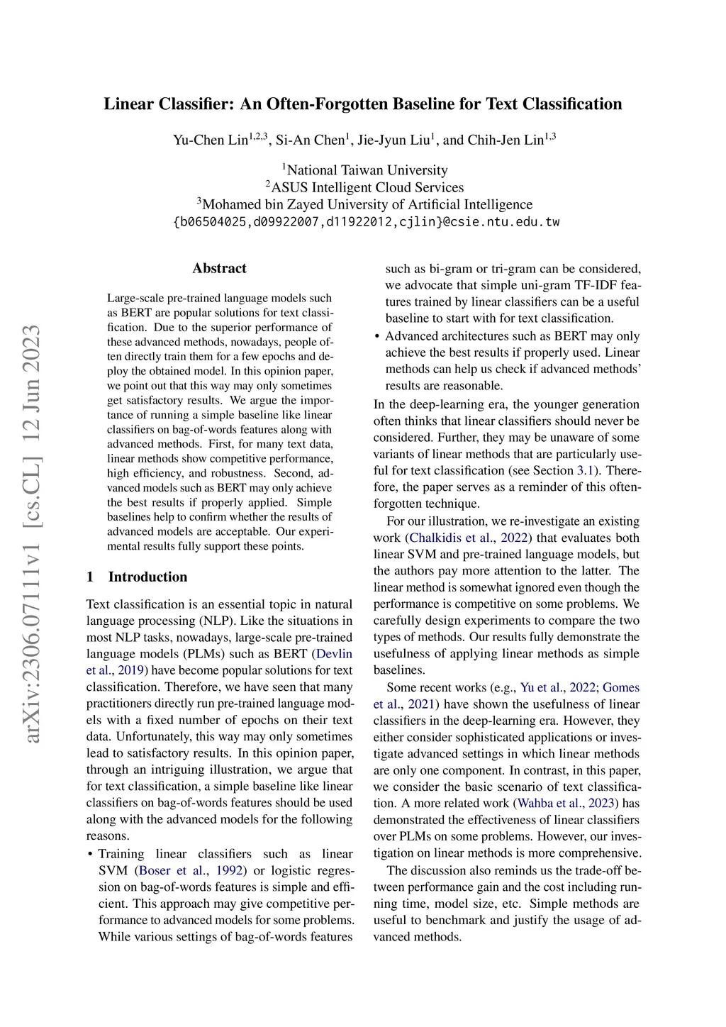Linear Classifier: An Often-Forgotten Baseline for Text Classification