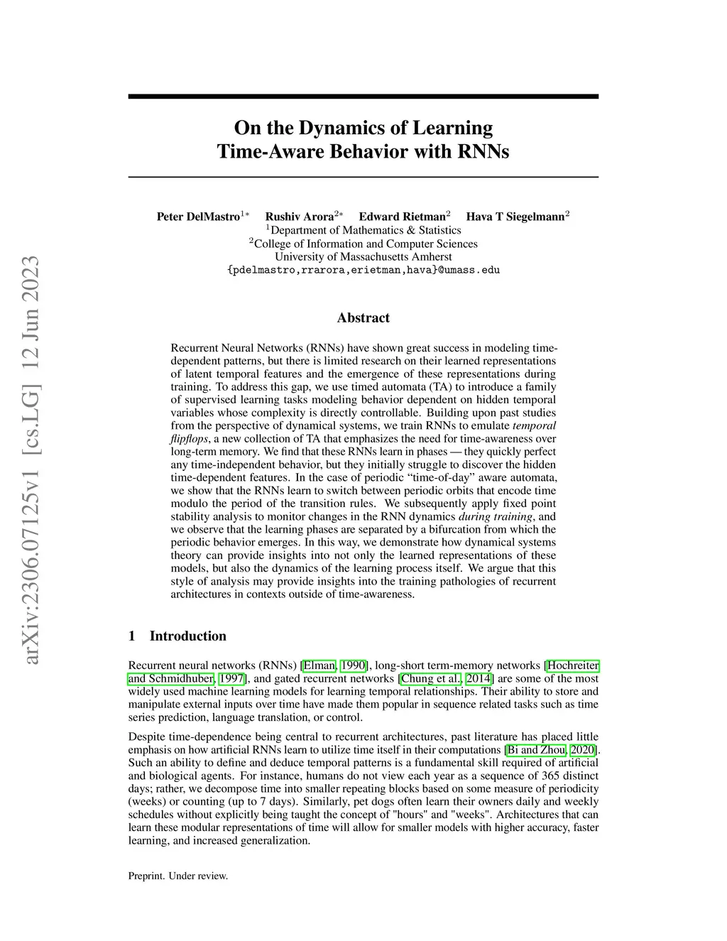 Recurrent Neural Networks (RNNs) have shown great success in modeling time-dependent patterns, but there is limited research on their learned representations of latent temporal features and the emergence of these representations during training. To address this gap, we use timed automata (TA) to introduce a family of supervised learning tasks modeling behavior dependent on hidden temporal variables whose complexity is directly controllable. Building upon past studies from the perspective of dynamical systems, we train RNNs to emulate temporal flipflops, a new collection of TA that emphasizes the need for time-awareness over long-term memory. We find that these RNNs learn in phases: they quickly perfect any time-independent behavior, but they initially struggle to discover the hidden time-dependent features. In the case of periodic "time-of-day" aware automata, we show that the RNNs learn to switch between periodic orbits that encode time modulo the period of the transition rules. We subsequently apply fixed point stability analysis to monitor changes in the RNN dynamics during training, and we observe that the learning phases are separated by a bifurcation from which the periodic behavior emerges. In this way, we demonstrate how dynamical systems theory can provide insights into not only the learned representations of these models, but also the dynamics of the learning process itself. We argue that this style of analysis may provide insights into the training pathologies of recurrent architectures in contexts outside of time-awareness.