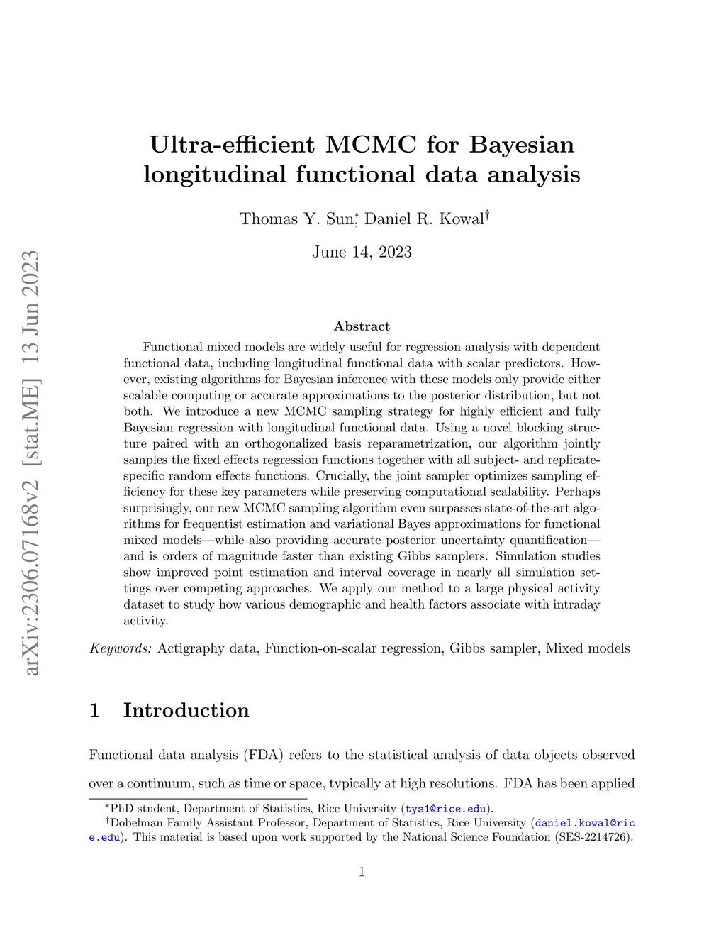 Functional mixed models are widely useful for regression analysis with dependent functional data, including longitudinal functional data with scalar predictors. However, existing algorithms for Bayesian inference with these models only provide either scalable computing or accurate approximations to the posterior distribution, but not both. We introduce a new MCMC sampling strategy for highly efficient and fully Bayesian regression with longitudinal functional data. Using a novel blocking structure paired with an orthogonalized basis reparametrization, our algorithm jointly samples the fixed effects regression functions together with all subject- and replicate-specific random effects functions. Crucially, the joint sampler optimizes sampling efficiency for these key parameters while preserving computational scalability. Perhaps surprisingly, our new MCMC sampling algorithm even surpasses state-of-the-art algorithms for frequentist estimation and variational Bayes approximations for functional mixed models -- while also providing accurate posterior uncertainty quantification -- and is orders of magnitude faster than existing Gibbs samplers. Simulation studies show improved point estimation and interval coverage in nearly all simulation settings over competing approaches. We apply our method to a large physical activity dataset to study how various demographic and health factors associate with intraday activity.