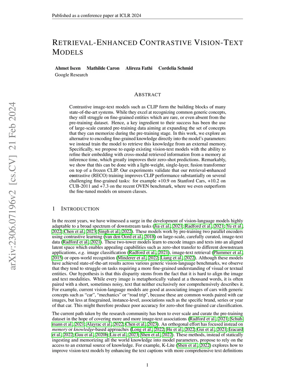 Contrastive image-text models such as CLIP form the building blocks of many state-of-the-art systems. While they excel at recognizing common generic concepts, they still struggle on fine-grained entities which are rare, or even absent from the pre-training dataset. Hence, a key ingredient to their success has been the use of large-scale curated pre-training data aiming at expanding the set of concepts that they can memorize during the pre-training stage. In this work, we explore an alternative to encoding fine-grained knowledge directly into the model's parameters: we instead train the model to retrieve this knowledge from an external memory. Specifically, we propose to equip existing vision-text models with the ability to refine their embedding with cross-modal retrieved information from a memory at inference time, which greatly improves their zero-shot predictions. Remarkably, we show that this can be done with a light-weight, single-layer, fusion transformer on top of a frozen CLIP. Our experiments validate that our retrieval-enhanced contrastive (RECO) training improves CLIP performance substantially on several challenging fine-grained tasks: for example +10.9 on Stanford Cars, +10.2 on CUB-2011 and +7.3 on the recent OVEN benchmark, where we even outperform the fine-tuned models on unseen classes.