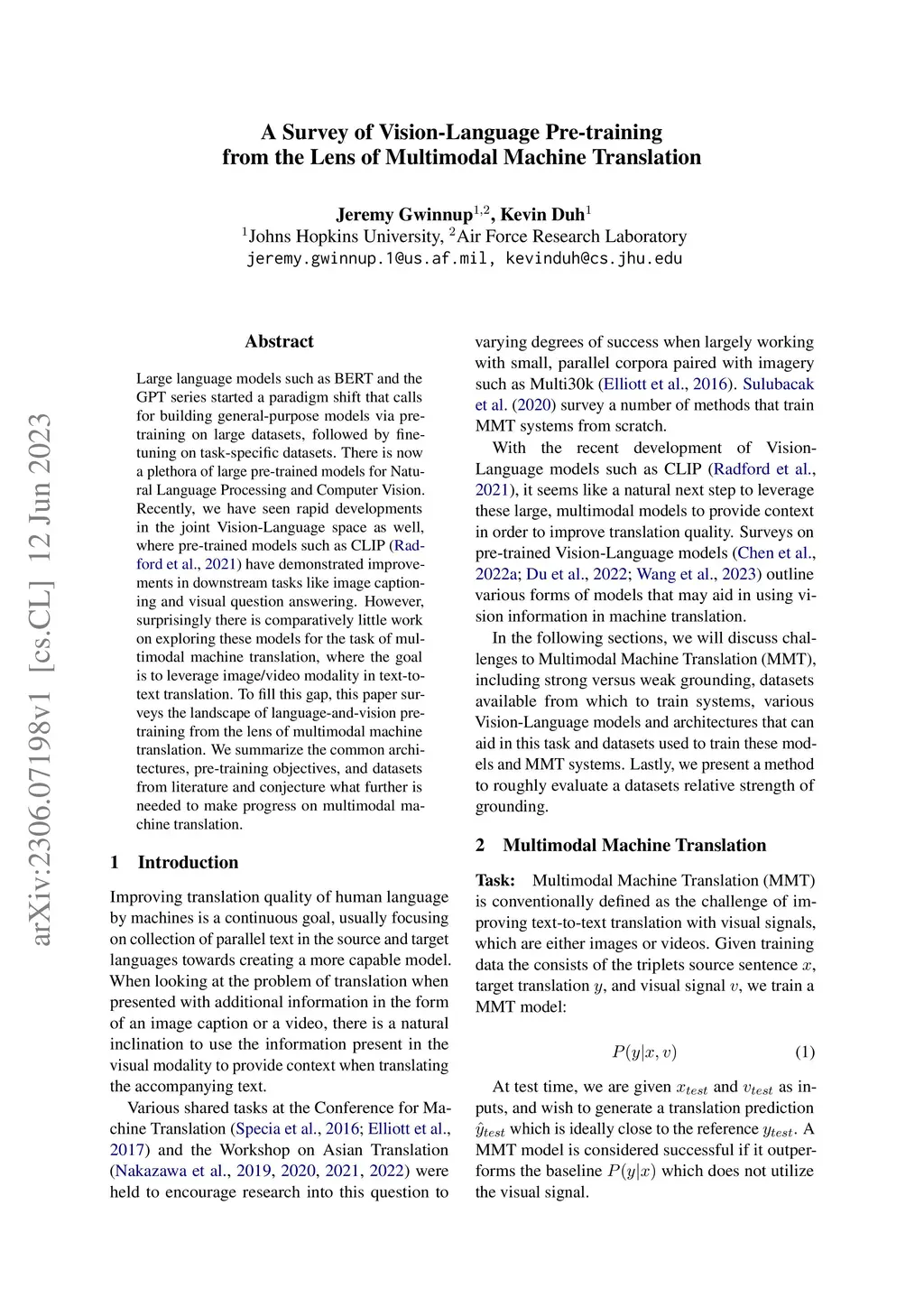 Large language models such as BERT and the GPT series started a paradigm shift that calls for building general-purpose models via pre-training on large datasets, followed by fine-tuning on task-specific datasets. There is now a plethora of large pre-trained models for Natural Language Processing and Computer Vision. Recently, we have seen rapid developments in the joint Vision-Language space as well, where pre-trained models such as CLIP (Radford et al., 2021) have demonstrated improvements in downstream tasks like image captioning and visual question answering. However, surprisingly there is comparatively little work on exploring these models for the task of multimodal machine translation, where the goal is to leverage image/video modality in text-to-text translation. To fill this gap, this paper surveys the landscape of language-and-vision pre-training from the lens of multimodal machine translation. We summarize the common architectures, pre-training objectives, and datasets from literature and conjecture what further is needed to make progress on multimodal machine translation.