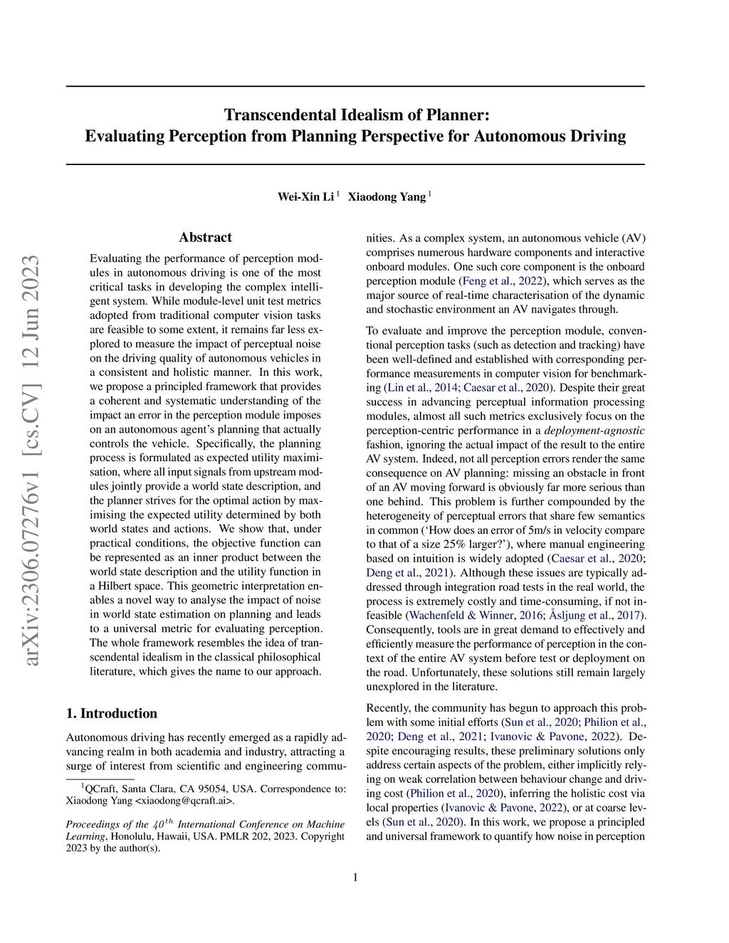 Evaluating the performance of perception modules in autonomous driving is one of the most critical tasks in developing the complex intelligent system. While module-level unit test metrics adopted from traditional computer vision tasks are feasible to some extent, it remains far less explored to measure the impact of perceptual noise on the driving quality of autonomous vehicles in a consistent and holistic manner. In this work, we propose a principled framework that provides a coherent and systematic understanding of the impact an error in the perception module imposes on an autonomous agent's planning that actually controls the vehicle. Specifically, the planning process is formulated as expected utility maximisation, where all input signals from upstream modules jointly provide a world state description, and the planner strives for the optimal action by maximising the expected utility determined by both world states and actions. We show that, under practical conditions, the objective function can be represented as an inner product between the world state description and the utility function in a Hilbert space. This geometric interpretation enables a novel way to analyse the impact of noise in world state estimation on planning and leads to a universal metric for evaluating perception. The whole framework resembles the idea of transcendental idealism in the classical philosophical literature, which gives the name to our approach.