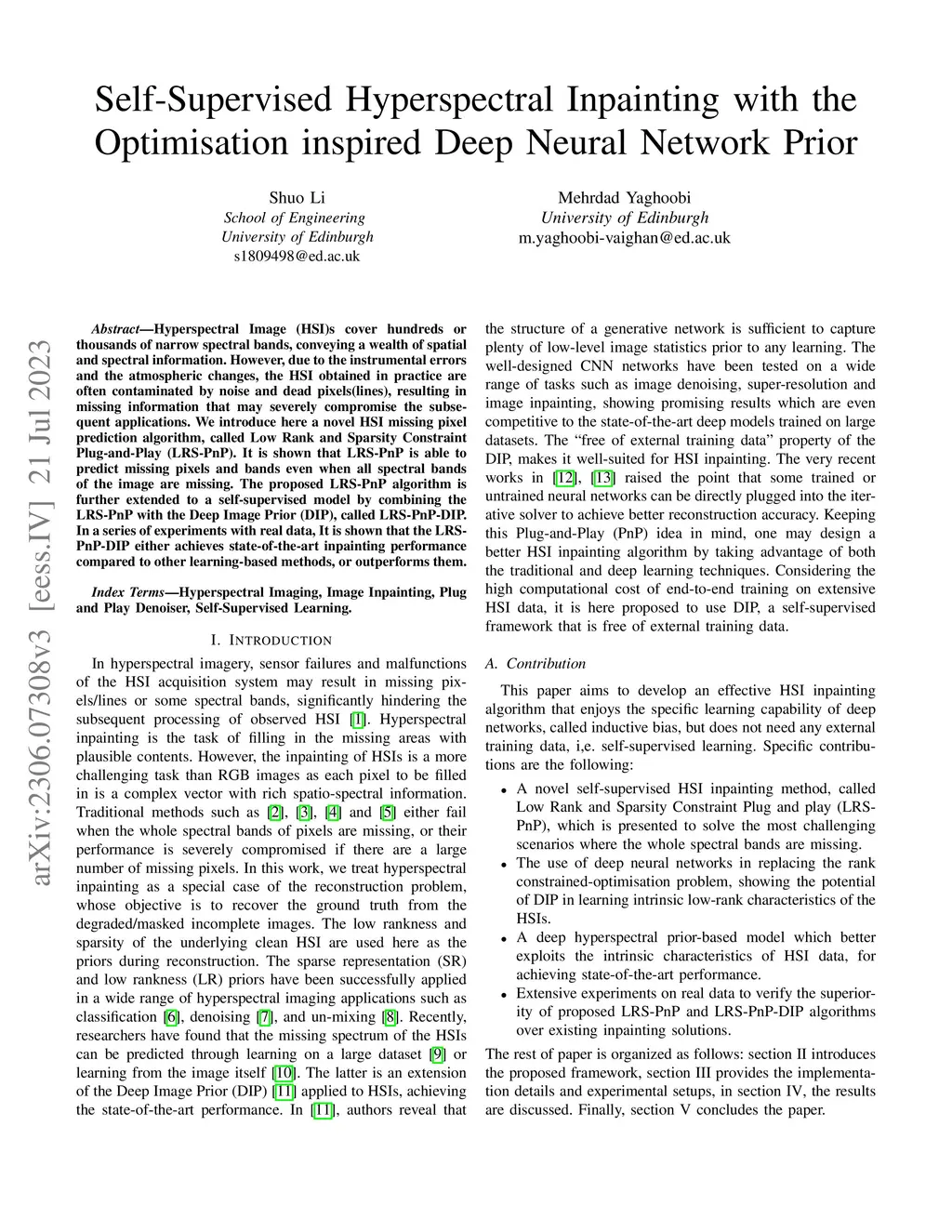 Self-Supervised Hyperspectral Inpainting with the Optimisation inspired