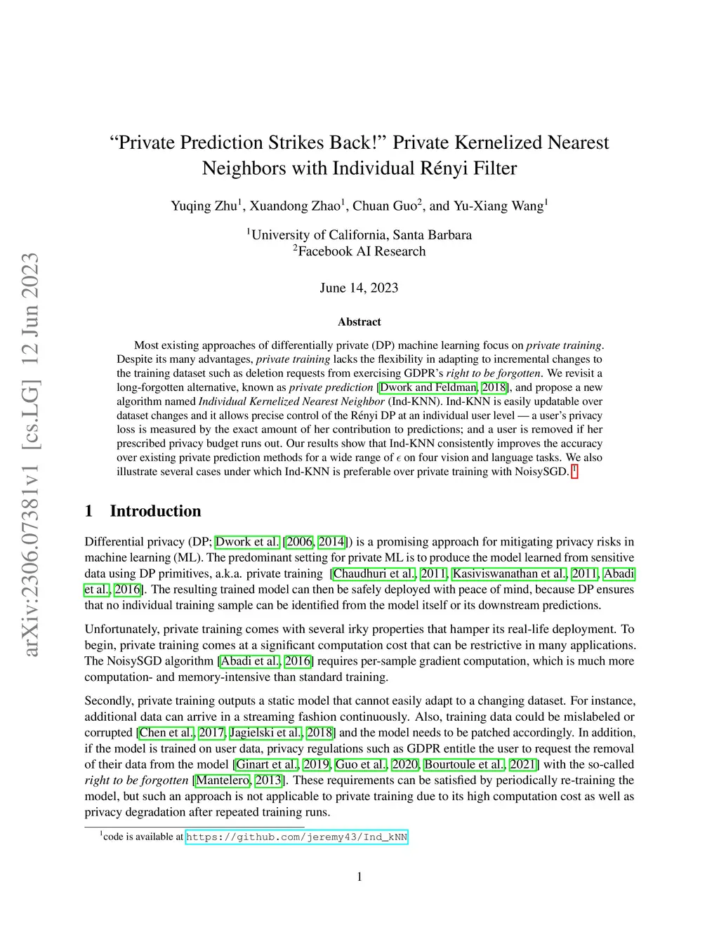 Most existing approaches of differentially private (DP) machine learning focus on private training. Despite its many advantages, private training lacks the flexibility in adapting to incremental changes to the training dataset such as deletion requests from exercising GDPR's right to be forgotten. We revisit a long-forgotten alternative, known as private prediction, and propose a new algorithm named Individual Kernelized Nearest Neighbor (Ind-KNN). Ind-KNN is easily updatable over dataset changes and it allows precise control of the R\'{e}nyi DP at an individual user level -- a user's privacy loss is measured by the exact amount of her contribution to predictions; and a user is removed if her prescribed privacy budget runs out. Our results show that Ind-KNN consistently improves the accuracy over existing private prediction methods for a wide range of on four vision and language tasks. We also illustrate several cases under which Ind-KNN is preferable over private training with NoisySGD.