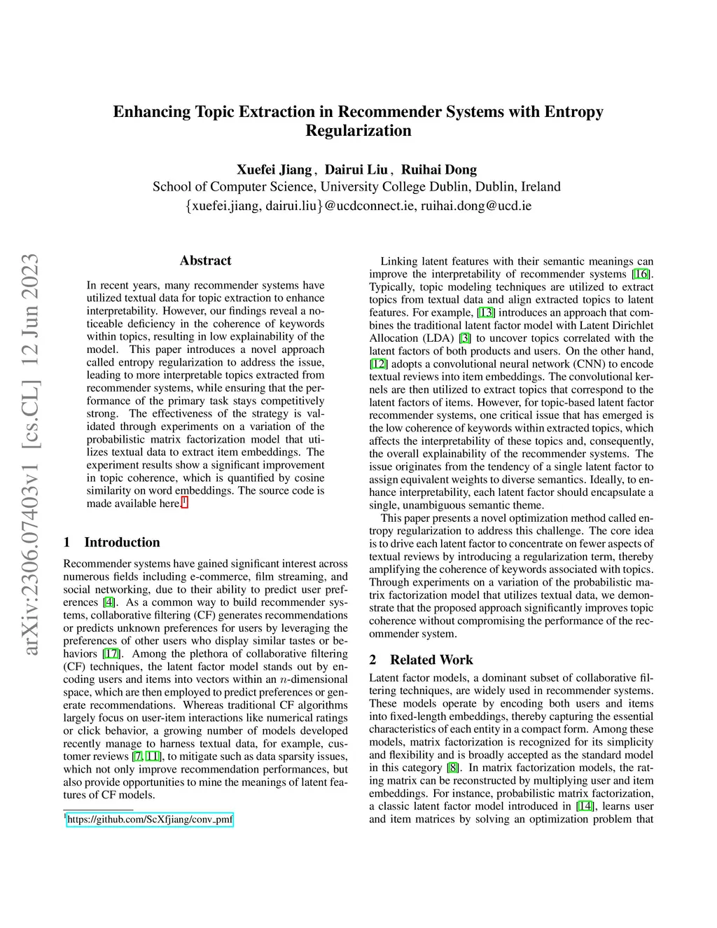 In recent years, many recommender systems have utilized textual data for topic extraction to enhance interpretability. However, our findings reveal a noticeable deficiency in the coherence of keywords within topics, resulting in low explainability of the model. This paper introduces a novel approach called entropy regularization to address the issue, leading to more interpretable topics extracted from recommender systems, while ensuring that the performance of the primary task stays competitively strong. The effectiveness of the strategy is validated through experiments on a variation of the probabilistic matrix factorization model that utilizes textual data to extract item embeddings. The experiment results show a significant improvement in topic coherence, which is quantified by cosine similarity on word embeddings.
