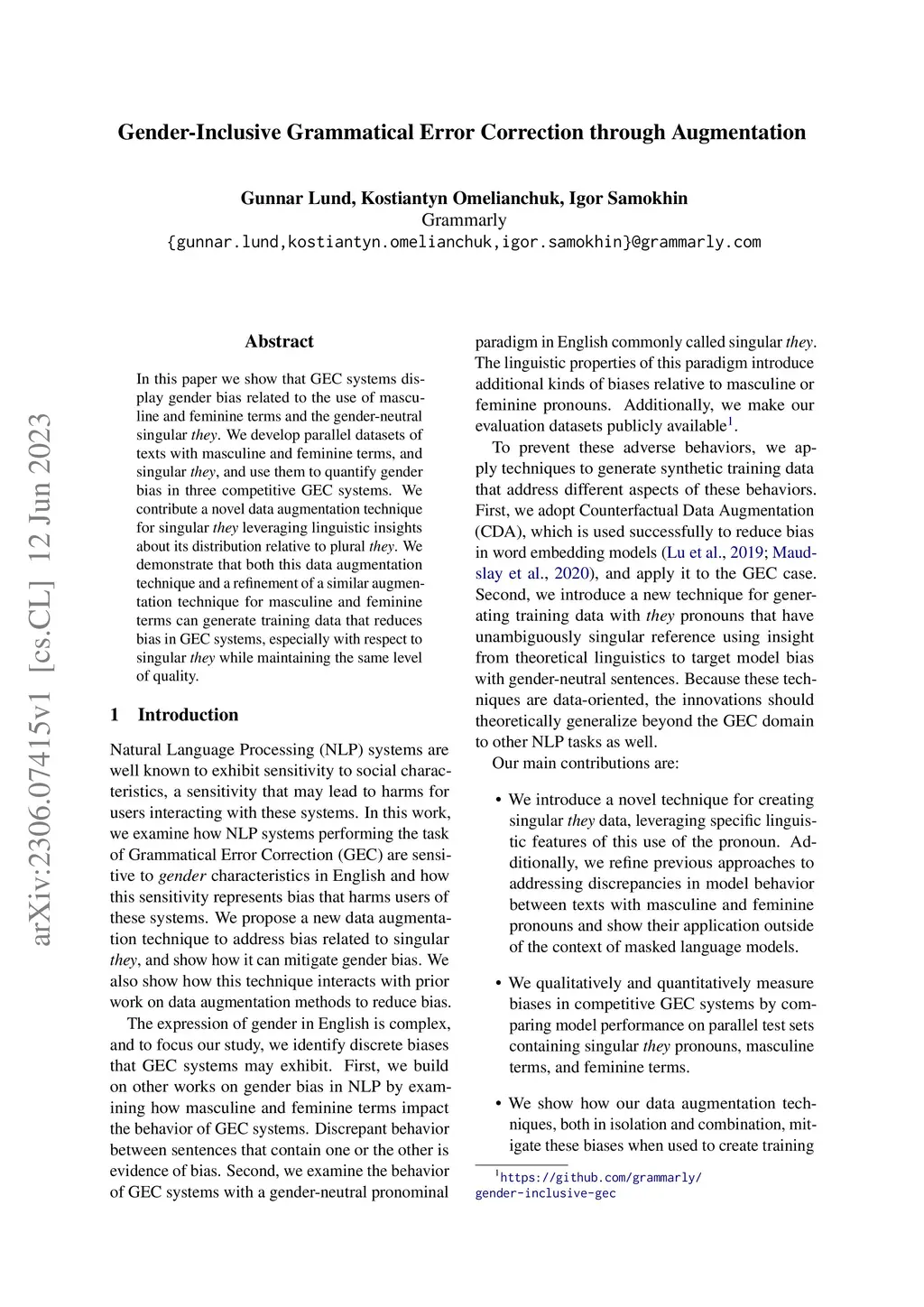 In this paper we show that GEC systems display gender bias related to the use of masculine and feminine terms and the gender-neutral singular "they". We develop parallel datasets of texts with masculine and feminine terms and singular "they" and use them to quantify gender bias in three competitive GEC systems. We contribute a novel data augmentation technique for singular "they" leveraging linguistic insights about its distribution relative to plural "they". We demonstrate that both this data augmentation technique and a refinement of a similar augmentation technique for masculine and feminine terms can generate training data that reduces bias in GEC systems, especially with respect to singular "they" while maintaining the same level of quality.