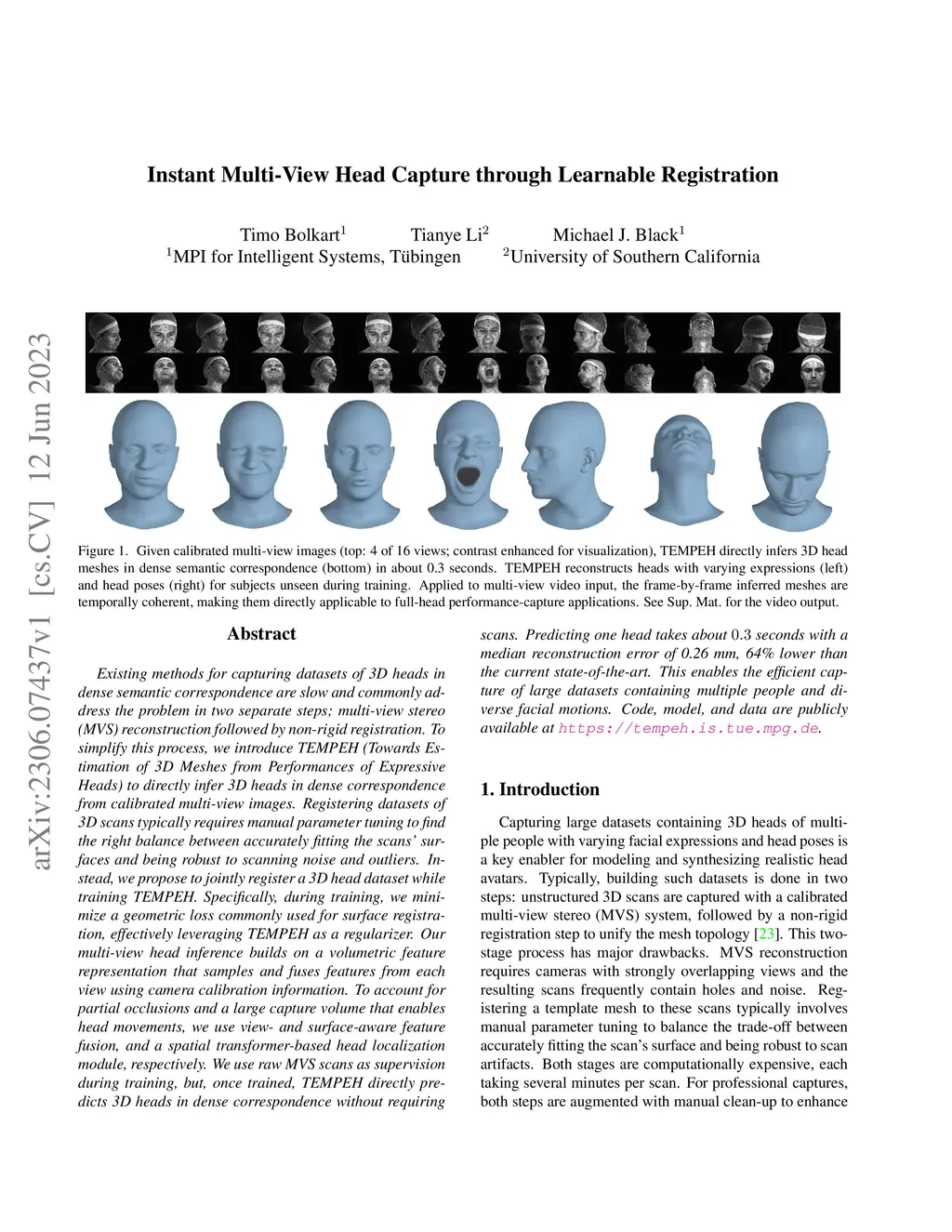Existing methods for capturing datasets of 3D heads in dense semantic correspondence are slow, and commonly address the problem in two separate steps; multi-view stereo (MVS) reconstruction followed by non-rigid registration. To simplify this process, we introduce TEMPEH (Towards Estimation of 3D Meshes from Performances of Expressive Heads) to directly infer 3D heads in dense correspondence from calibrated multi-view images. Registering datasets of 3D scans typically requires manual parameter tuning to find the right balance between accurately fitting the scans surfaces and being robust to scanning noise and outliers. Instead, we propose to jointly register a 3D head dataset while training TEMPEH. Specifically, during training we minimize a geometric loss commonly used for surface registration, effectively leveraging TEMPEH as a regularizer. Our multi-view head inference builds on a volumetric feature representation that samples and fuses features from each view using camera calibration information. To account for partial occlusions and a large capture volume that enables head movements, we use view- and surface-aware feature fusion, and a spatial transformer-based head localization module, respectively. We use raw MVS scans as supervision during training, but, once trained, TEMPEH directly predicts 3D heads in dense correspondence without requiring scans. Predicting one head takes about 0.3 seconds with a median reconstruction error of 0.26 mm, 64% lower than the current state-of-the-art. This enables the efficient capture of large datasets containing multiple people and diverse facial motions. Code, model, and data are publicly available at https://tempeh.is.tue.mpg.de.