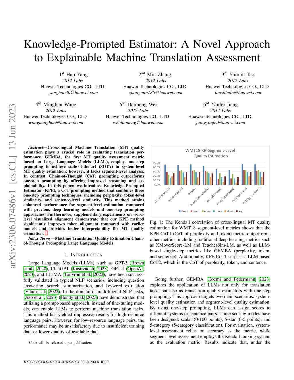 Cross-lingual Machine Translation (MT) quality estimation plays a crucial role in evaluating translation performance. GEMBA, the first MT quality assessment metric based on Large Language Models (LLMs), employs one-step prompting to achieve state-of-the-art (SOTA) in system-level MT quality estimation; however, it lacks segment-level analysis. In contrast, Chain-of-Thought (CoT) prompting outperforms one-step prompting by offering improved reasoning and explainability. In this paper, we introduce Knowledge-Prompted Estimator (KPE), a CoT prompting method that combines three one-step prompting techniques, including perplexity, token-level similarity, and sentence-level similarity. This method attains enhanced performance for segment-level estimation compared with previous deep learning models and one-step prompting approaches. Furthermore, supplementary experiments on word-level visualized alignment demonstrate that our KPE method significantly improves token alignment compared with earlier models and provides better interpretability for MT quality estimation. Code will be released upon publication.