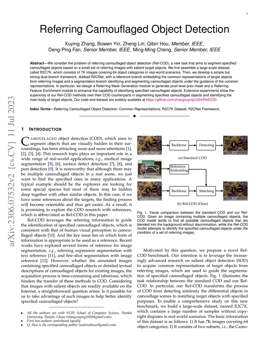 We consider the problem of referring camouflaged object detection (Ref-COD), a new task that aims to segment specified camouflaged objects based on a small set of referring images with salient target objects. We first assemble a large-scale dataset, called R2C7K, which consists of 7K images covering 64 object categories in real-world scenarios. Then, we develop a simple but strong dual-branch framework, dubbed R2CNet, with a reference branch embedding the common representations of target objects from referring images and a segmentation branch identifying and segmenting camouflaged objects under the guidance of the common representations. In particular, we design a Referring Mask Generation module to generate pixel-level prior mask and a Referring Feature Enrichment module to enhance the capability of identifying specified camouflaged objects. Extensive experiments show the superiority of our Ref-COD methods over their COD counterparts in segmenting specified camouflaged objects and identifying the main body of target objects. Our code and dataset are publicly available atthis https URL.