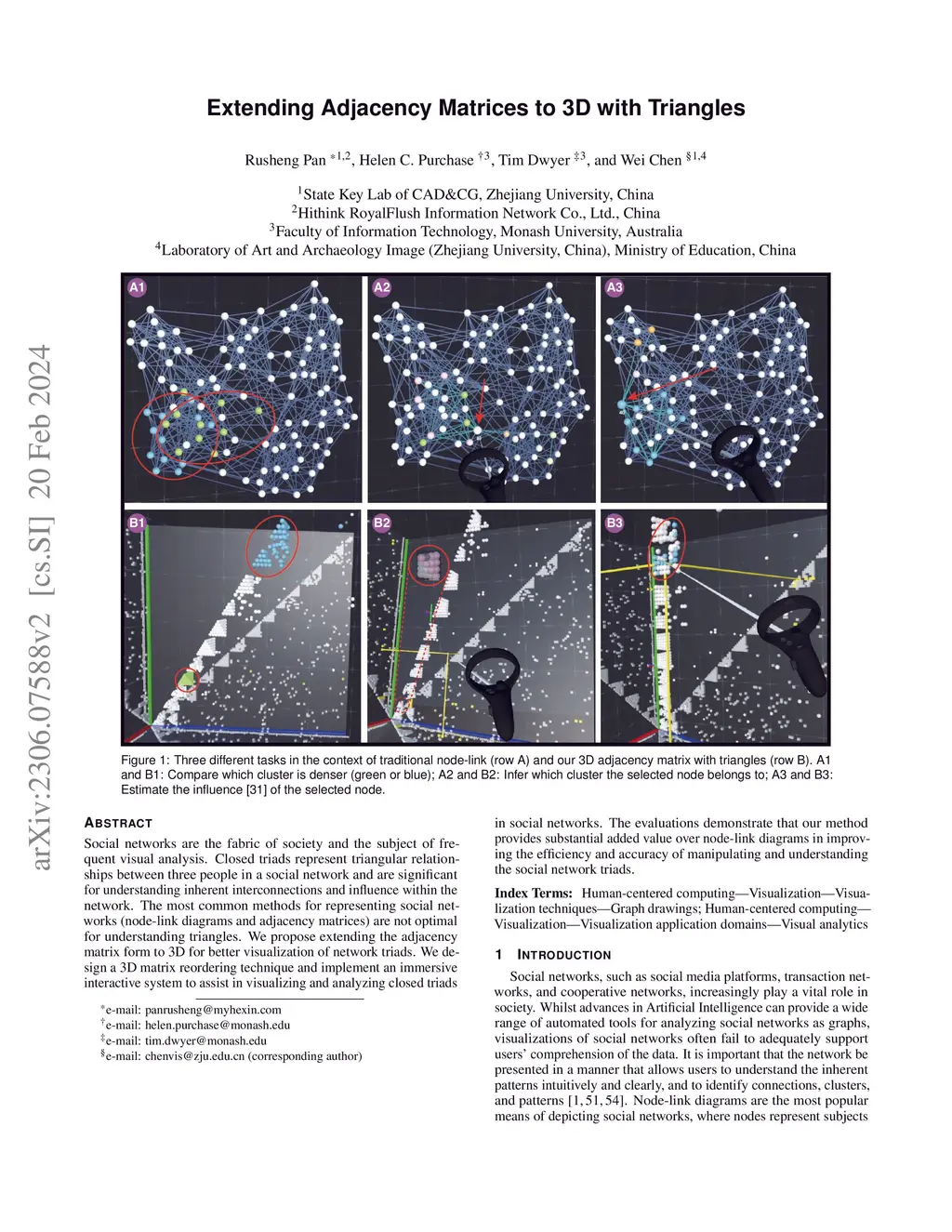 Social networks are the fabric of society and the subject of frequent visual analysis. Closed triads represent triangular relationships between three people in a social network and are significant for understanding inherent interconnections and influence within the network. The most common methods for representing social networks (node-link diagrams and adjacency matrices) are not optimal for understanding triangles. We propose extending the adjacency matrix form to 3D for better visualization of network triads. We design a 3D matrix reordering technique and implement an immersive interactive system to assist in visualizing and analyzing closed triads in social networks. A user study and usage scenarios demonstrate that our method provides substantial added value over node-link diagrams in improving the efficiency and accuracy of manipulating and understanding the social network triads.