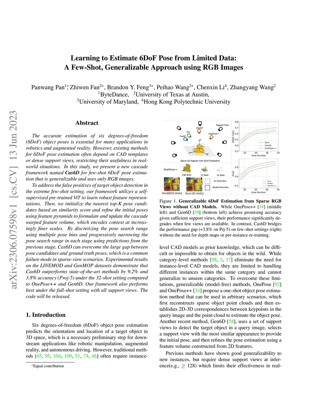 The accurate estimation of six degrees-of-freedom (6DoF) object poses is essential for many applications in robotics and augmented reality. However, existing methods for 6DoF pose estimation often depend on CAD templates or dense support views, restricting their usefulness in realworld situations. In this study, we present a new cascade framework named Cas6D for few-shot 6DoF pose estimation that is generalizable and uses only RGB images. To address the false positives of target object detection in the extreme few-shot setting, our framework utilizes a selfsupervised pre-trained ViT to learn robust feature representations. Then, we initialize the nearest top-K pose candidates based on similarity score and refine the initial poses using feature pyramids to formulate and update the cascade warped feature volume, which encodes context at increasingly finer scales. By discretizing the pose search range using multiple pose bins and progressively narrowing the pose search range in each stage using predictions from the previous stage, Cas6D can overcome the large gap between pose candidates and ground truth poses, which is a common failure mode in sparse-view scenarios. Experimental results on the LINEMOD and GenMOP datasets demonstrate that Cas6D outperforms state-of-the-art methods by 9.2% and 3.8% accuracy (Proj-5) under the 32-shot setting compared to OnePose++ and Gen6D.