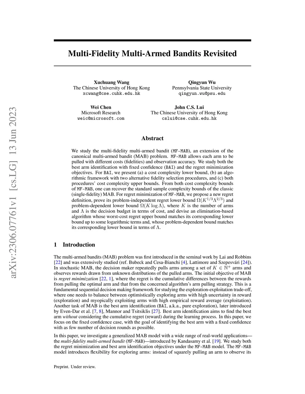 We study the multi-fidelity multi-armed bandit (MF-MAB), an extension of the canonical multi-armed bandit (MAB) problem. MF-MAB allows each arm to be pulled with different costs (fidelities) and observation accuracy. We study both the best arm identification with fixed confidence (BAI) and the regret minimization objectives. For BAI, we present (a) a cost complexity lower bound, (b) an algorithmic framework with two alternative fidelity selection procedures, and (c) both procedures' cost complexity upper bounds. From both cost complexity bounds of MF-MAB, one can recover the standard sample complexity bounds of the classic (single-fidelity) MAB. For regret minimization of MF-MAB, we propose a new regret definition, prove its problem-independent regret lower bound and problem-dependent lower bound , where is the number of arms and is the decision budget in terms of cost, and devise an elimination-based algorithm whose worst-cost regret upper bound matches its corresponding lower bound up to some logarithmic terms and, whose problem-dependent bound matches its corresponding lower bound in terms of .