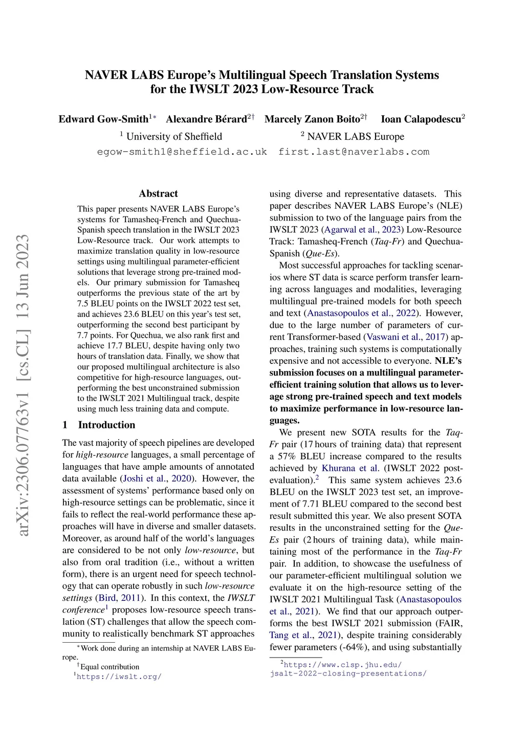 This paper presents NAVER LABS Europe's systems for Tamasheq-French and Quechua-Spanish speech translation in the IWSLT 2023 Low-Resource track. Our work attempts to maximize translation quality in low-resource settings using multilingual parameter-efficient solutions that leverage strong pre-trained models. Our primary submission for Tamasheq outperforms the previous state of the art by 7.5 BLEU points on the IWSLT 2022 test set, and achieves 23.6 BLEU on this year's test set, outperforming the second best participant by 7.7 points. For Quechua, we also rank first and achieve 17.7 BLEU, despite having only two hours of translation data. Finally, we show that our proposed multilingual architecture is also competitive for high-resource languages, outperforming the best unconstrained submission to the IWSLT 2021 Multilingual track, despite using much less training data and compute.