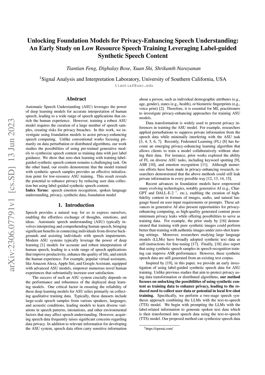 Automatic Speech Understanding (ASU) leverages the power of deep learning models for accurate interpretation of human speech, leading to a wide range of speech applications that enrich the human experience. However, training a robust ASU model requires the curation of a large number of speech samples, creating risks for privacy breaches. In this work, we investigate using foundation models to assist privacy-enhancing speech computing. Unlike conventional works focusing primarily on data perturbation or distributed algorithms, our work studies the possibilities of using pre-trained generative models to synthesize speech content as training data with just label guidance. We show that zero-shot learning with training label-guided synthetic speech content remains a challenging task. On the other hand, our results demonstrate that the model trained with synthetic speech samples provides an effective initialization point for low-resource ASU training. This result reveals the potential to enhance privacy by reducing user data collection but using label-guided synthetic speech content.
