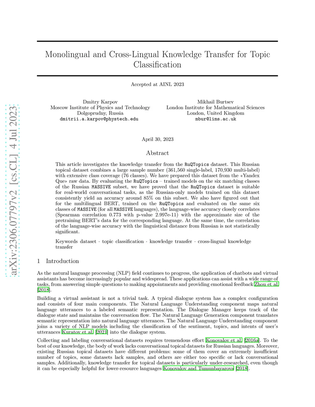 This article investigates the knowledge transfer from the RuQTopics dataset. This Russian topical dataset combines a large sample number (361,560 single-label, 170,930 multi-label) with extensive class coverage (76 classes). We have prepared this dataset from the "Yandex Que" raw data. By evaluating the RuQTopics - trained models on the six matching classes of the Russian MASSIVE subset, we have proved that the RuQTopics dataset is suitable for real-world conversational tasks, as the Russian-only models trained on this dataset consistently yield an accuracy around 85\% on this subset. We also have figured out that for the multilingual BERT, trained on the RuQTopics and evaluated on the same six classes of MASSIVE (for all MASSIVE languages), the language-wise accuracy closely correlates (Spearman correlation 0.773 with p-value 2.997e-11) with the approximate size of the pretraining BERT's data for the corresponding language. At the same time, the correlation of the language-wise accuracy with the linguistical distance from Russian is not statistically significant.