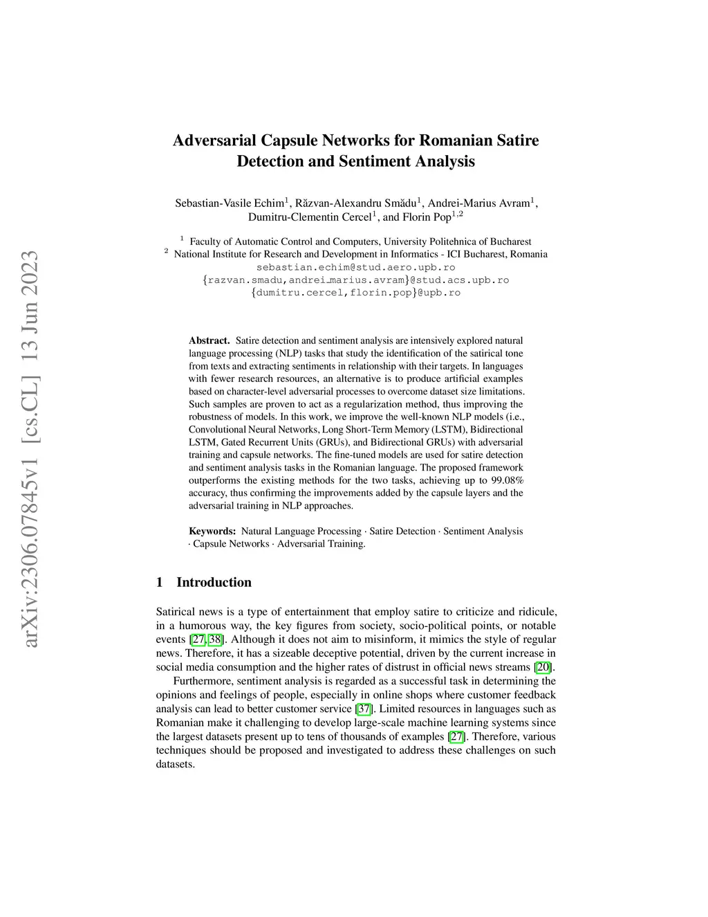 Adversarial Capsule Networks for Romanian Satire Detection and Sentiment