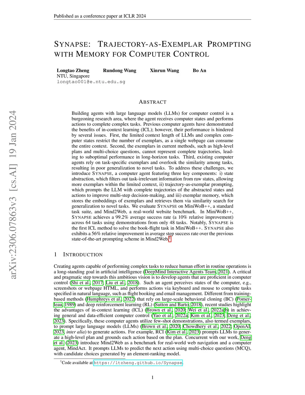 Building agents with large language models (LLMs) for computer control is a burgeoning research area, where the agent receives computer states and performs actions to complete complex tasks. Previous computer agents have demonstrated the benefits of in-context learning (ICL); however, their performance is hindered by several issues. First, the limited context length of LLMs and complex computer states restrict the number of exemplars, as a single webpage can consume the entire context. Second, the exemplars in current methods, such as high-level plans and multi-choice questions, cannot represent complete trajectories, leading to suboptimal performance in long-horizon tasks. Third, existing computer agents rely on task-specific exemplars and overlook the similarity among tasks, resulting in poor generalization to novel tasks. To address these challenges, we introduce Synapse, a computer agent featuring three key components: i) state abstraction, which filters out task-irrelevant information from raw states, allowing more exemplars within the limited context, ii) trajectory-as-exemplar prompting, which prompts the LLM with complete trajectories of the abstracted states and actions to improve multi-step decision-making, and iii) exemplar memory, which stores the embeddings of exemplars and retrieves them via similarity search for generalization to novel tasks. We evaluate Synapse on MiniWoB++, a standard task suite, and Mind2Web, a real-world website benchmark. In MiniWoB++, Synapse achieves a 99.2% average success rate (a 10% relative improvement) across 64 tasks using demonstrations from only 48 tasks. Notably, Synapse is the first ICL method to solve the book-flight task in MiniWoB++. Synapse also exhibits a 56% relative improvement in average step success rate over the previous state-of-the-art prompting scheme in Mind2Web.