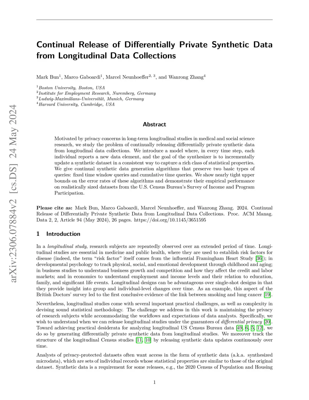Motivated by privacy concerns in long-term longitudinal studies in medical and social science research, we study the problem of continually releasing differentially private synthetic data from longitudinal data collections. We introduce a model where, in every time step, each individual reports a new data element, and the goal of the synthesizer is to incrementally update a synthetic dataset in a consistent way to capture a rich class of statistical properties. We give continual synthetic data generation algorithms that preserve two basic types of queries: fixed time window queries and cumulative time queries. We show nearly tight upper bounds on the error rates of these algorithms and demonstrate their empirical performance on realistically sized datasets from the U.S. Census Bureau's Survey of Income and Program Participation.