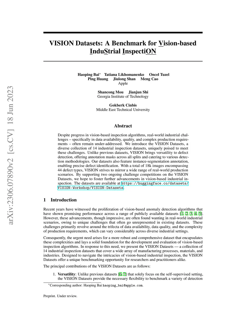 Despite progress in vision-based inspection algorithms, real-world industrial challenges -- specifically in data availability, quality, and complex production requirements -- often remain under-addressed. We introduce the VISION Datasets, a diverse collection of 14 industrial inspection datasets, uniquely poised to meet these challenges. Unlike previous datasets, VISION brings versatility to defect detection, offering annotation masks across all splits and catering to various detection methodologies. Our datasets also feature instance-segmentation annotation, enabling precise defect identification. With a total of 18k images encompassing 44 defect types, VISION strives to mirror a wide range of real-world production scenarios. By supporting two ongoing challenge competitions on the VISION Datasets, we hope to foster further advancements in vision-based industrial inspection.