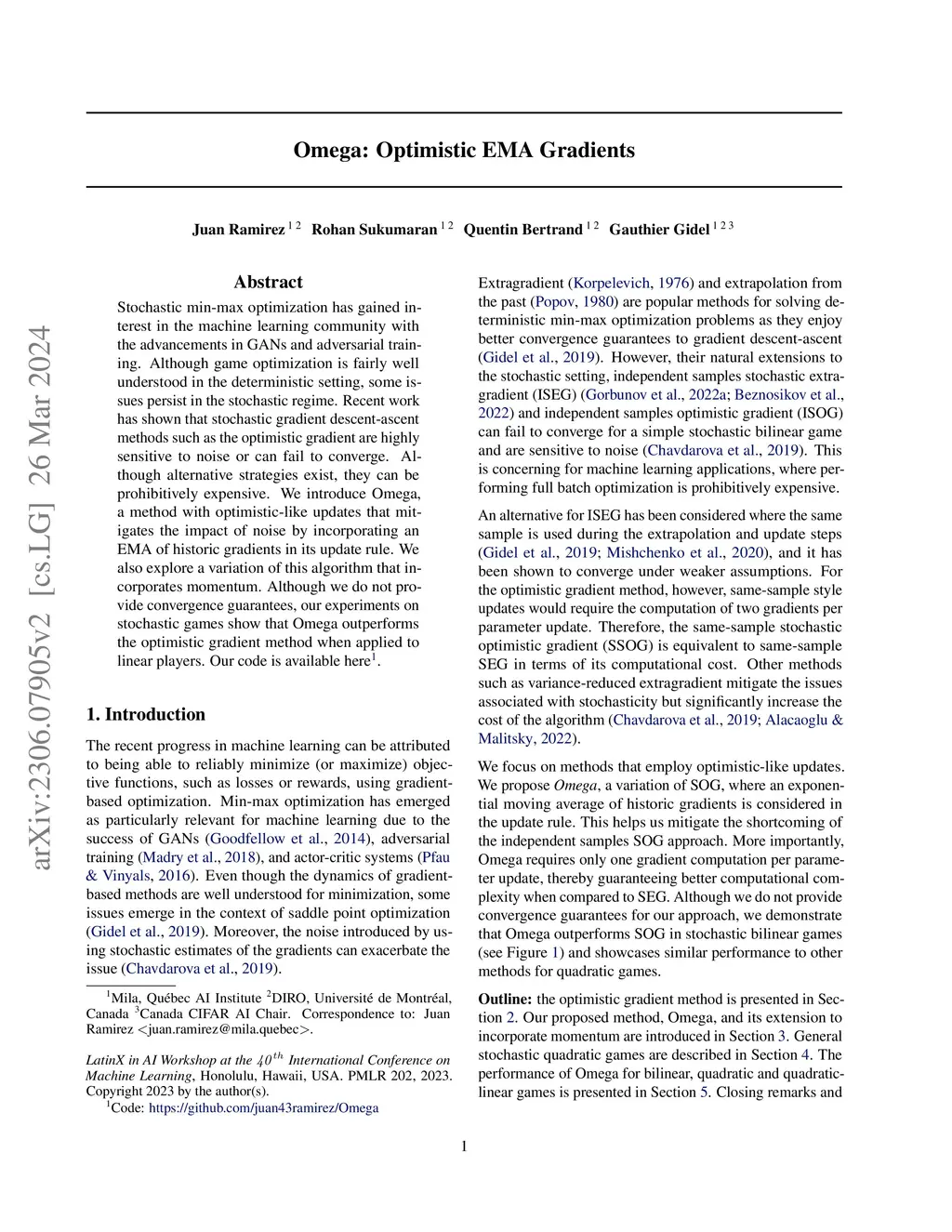Stochastic min-max optimization has gained interest in the machine learning community with the advancements in GANs and adversarial training. Although game optimization is fairly well understood in the deterministic setting, some issues persist in the stochastic regime. Recent work has shown that stochastic gradient descent-ascent methods such as the optimistic gradient are highly sensitive to noise or can fail to converge. Although alternative strategies exist, they can be prohibitively expensive. We introduce Omega, a method with optimistic-like updates that mitigates the impact of noise by incorporating an EMA of historic gradients in its update rule. We also explore a variation of this algorithm that incorporates momentum. Although we do not provide convergence guarantees, our experiments on stochastic games show that Omega outperforms the optimistic gradient method when applied to linear players.