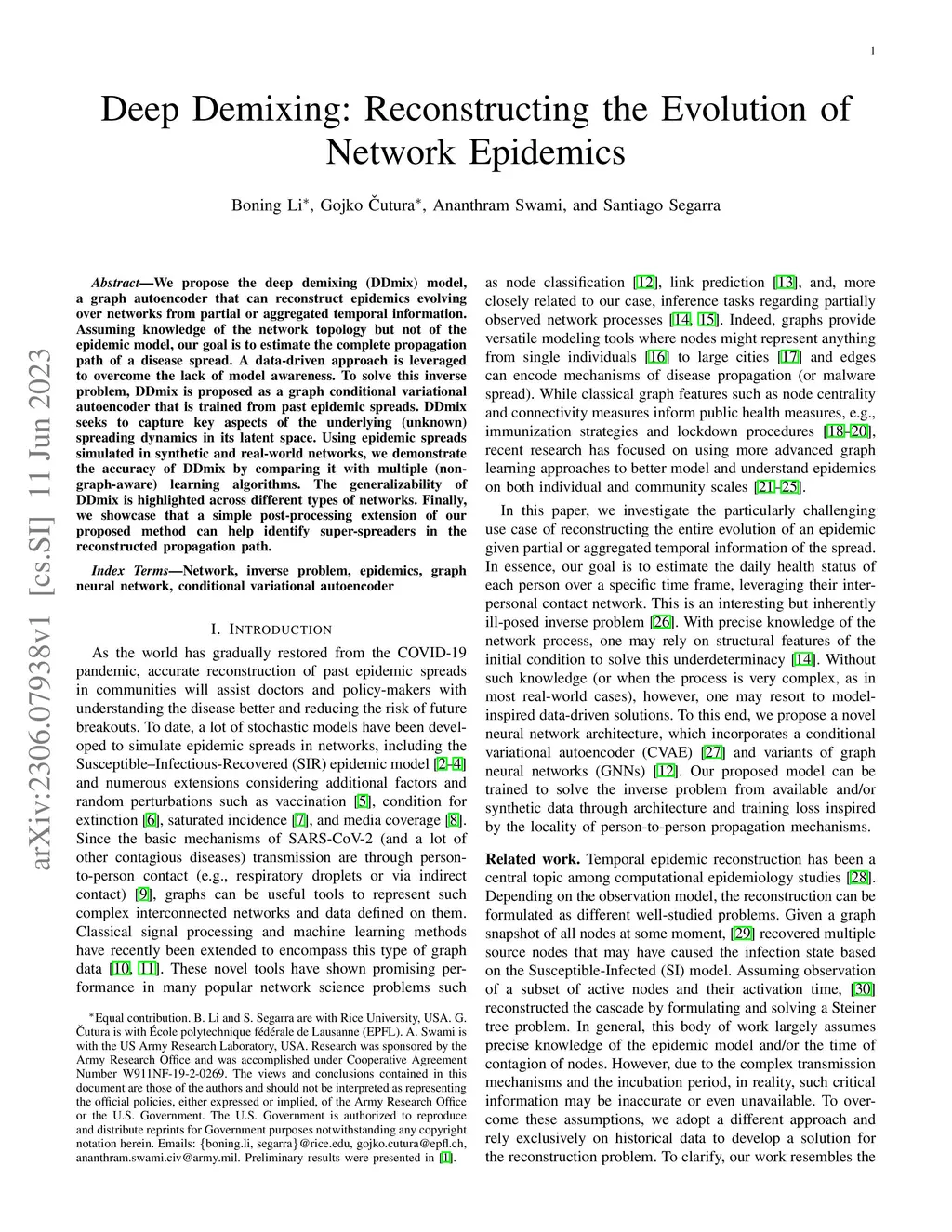 We propose the deep demixing (DDmix) model, a graph autoencoder that can reconstruct epidemics evolving over networks from partial or aggregated temporal information. Assuming knowledge of the network topology but not of the epidemic model, our goal is to estimate the complete propagation path of a disease spread. A data-driven approach is leveraged to overcome the lack of model awareness. To solve this inverse problem, DDmix is proposed as a graph conditional variational autoencoder that is trained from past epidemic spreads. DDmix seeks to capture key aspects of the underlying (unknown) spreading dynamics in its latent space. Using epidemic spreads simulated in synthetic and real-world networks, we demonstrate the accuracy of DDmix by comparing it with multiple (non-graph-aware) learning algorithms. The generalizability of DDmix is highlighted across different types of networks. Finally, we showcase that a simple post-processing extension of our proposed method can help identify super-spreaders in the reconstructed propagation path.