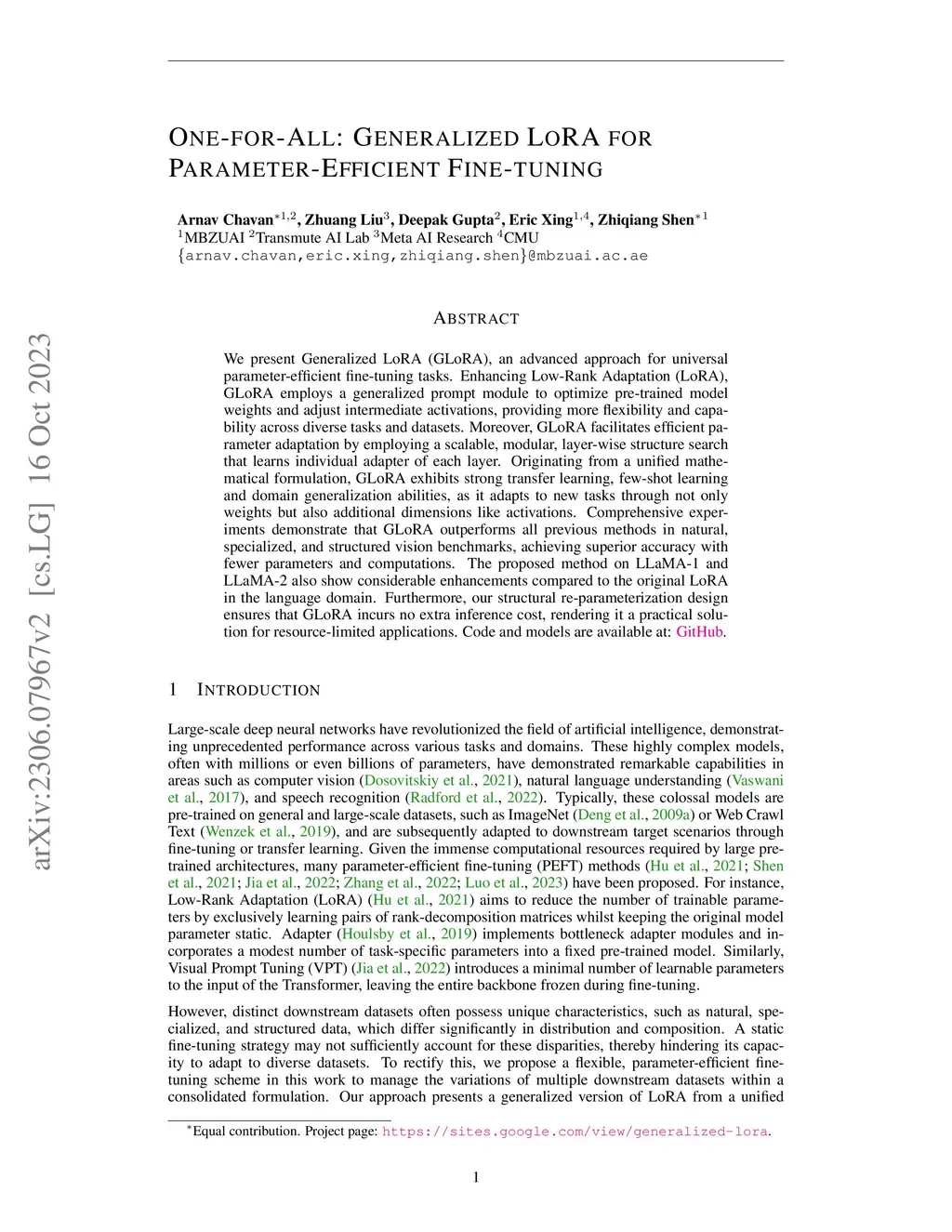 We present Generalized LoRA (GLoRA), an advanced approach for universal parameter-efficient fine-tuning tasks. Enhancing Low-Rank Adaptation (LoRA), GLoRA employs a generalized prompt module to optimize pre-trained model weights and adjust intermediate activations, providing more flexibility and capability across diverse tasks and datasets. Moreover, GLoRA facilitates efficient parameter adaptation by employing a scalable, modular, layer-wise structure search that learns individual adapter of each layer. Originating from a unified mathematical formulation, GLoRA exhibits strong transfer learning, few-shot learning and domain generalization abilities, as it adapts to new tasks through not only weights but also additional dimensions like activations. Comprehensive experiments demonstrate that GLoRA outperforms all previous methods in natural, specialized, and structured vision benchmarks, achieving superior accuracy with fewer parameters and computations. The proposed method on LLaMA-1 and LLaMA-2 also show considerable enhancements compared to the original LoRA in the language domain. Furthermore, our structural re-parameterization design ensures that GLoRA incurs no extra inference cost, rendering it a practical solution for resource-limited applications. Code and models are available at: https://github.com/Arnav0400/ViT-Slim/tree/master/GLoRA.
