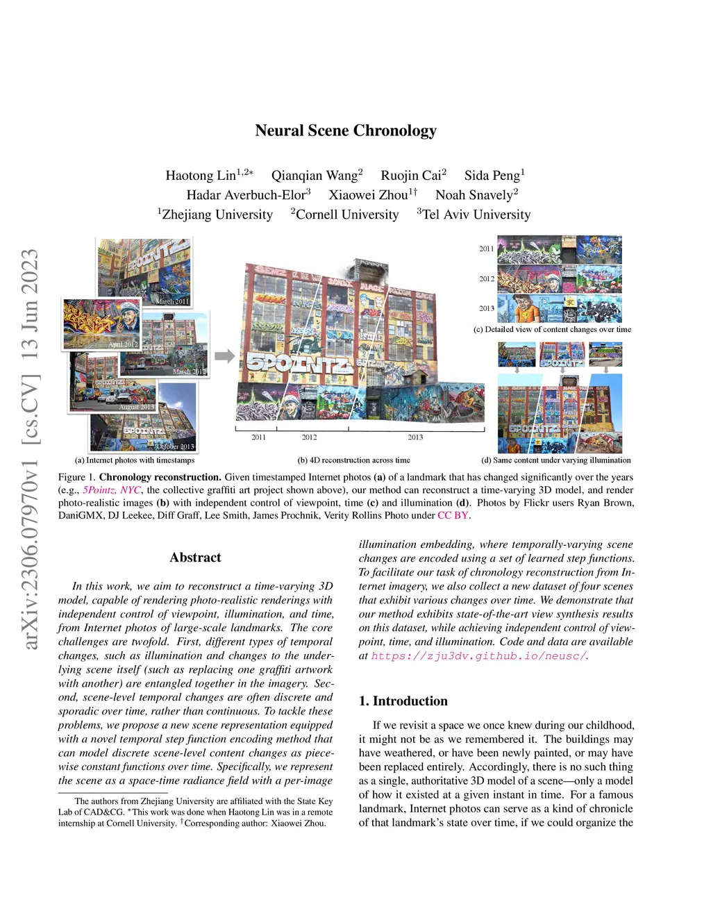 In this work, we aim to reconstruct a time-varying 3D model, capable of rendering photo-realistic renderings with independent control of viewpoint, illumination, and time, from Internet photos of large-scale landmarks. The core challenges are twofold. First, different types of temporal changes, such as illumination and changes to the underlying scene itself (such as replacing one graffiti artwork with another) are entangled together in the imagery. Second, scene-level temporal changes are often discrete and sporadic over time, rather than continuous. To tackle these problems, we propose a new scene representation equipped with a novel temporal step function encoding method that can model discrete scene-level content changes as piece-wise constant functions over time. Specifically, we represent the scene as a space-time radiance field with a per-image illumination embedding, where temporally-varying scene changes are encoded using a set of learned step functions. To facilitate our task of chronology reconstruction from Internet imagery, we also collect a new dataset of four scenes that exhibit various changes over time. We demonstrate that our method exhibits state-of-the-art view synthesis results on this dataset, while achieving independent control of viewpoint, time, and illumination.
