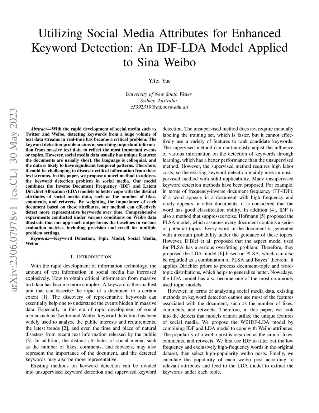 With the rapid development of social media such as Twitter and Weibo, detecting keywords from a huge volume of text data streams in real-time has become a critical problem. The keyword detection problem aims at searching important information from massive text data to reflect the most important events or topics. However, social media data usually has unique features: the documents are usually short, the language is colloquial, and the data is likely to have significant temporal patterns. Therefore, it could be challenging to discover critical information from these text streams. In this paper, we propose a novel method to address the keyword detection problem in social media. Our model combines the Inverse Document Frequency (IDF) and Latent Dirichlet Allocation (LDA) models to better cope with the distinct attributes of social media data, such as the number of likes, comments, and retweets. By weighting the importance of each document based on these attributes, our method can effectively detect more representative keywords over time. Comprehensive experiments conducted under various conditions on Weibo data illustrate that our approach outperforms the baselines in various evaluation metrics, including precision and recall for multiple problem settings.